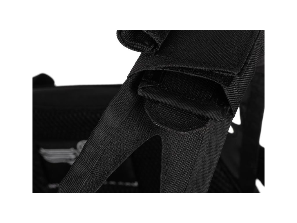 In the upper front part, there are velcro panels for patches and a rescue handle in the back for quick and easy evacuation from a dangerous zone. In the front, we find 3 flat pouches for M4-style magazines – if needed, these pockets can be completely closed to provide the user with a completely flat space. Around the shoulders, there are eight elastic straps for attaching Comtac cables or hydration tubes. The inside of the vest and shoulders are reinforced with soft spacer mesh, ensuring comfort and air circulation.