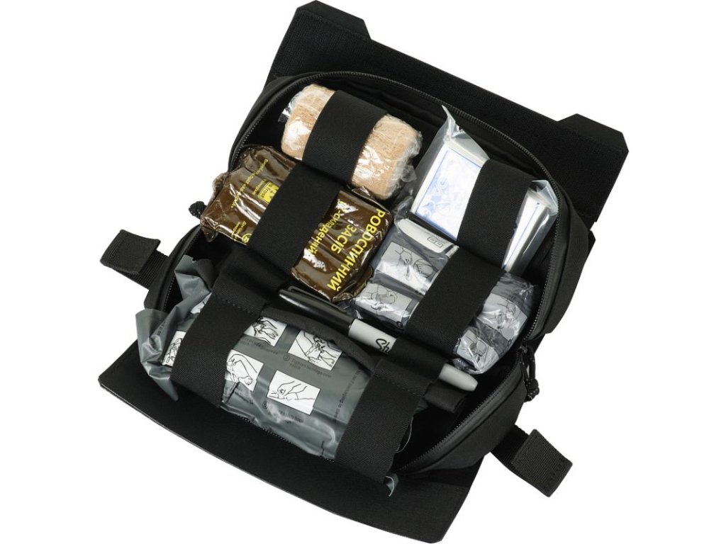 Inside the first aid kit, there is an organizer made of elastic bands for attaching first aid kits (not included). The front flap of the first aid pouch is equipped with an identifier in two colors - traditional for first aid kits, red or black, to make the pouch less noticeable.