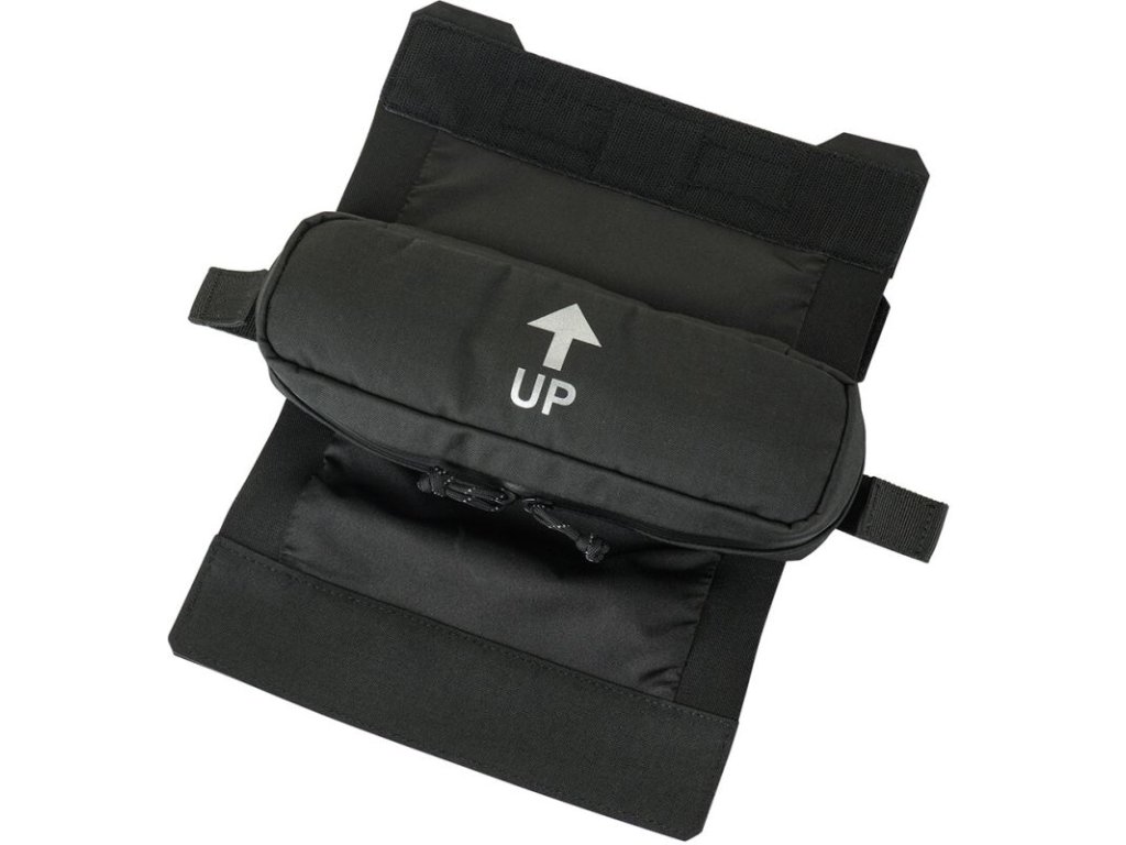 The pouch consists of two parts: an outer pocket, which is an accessory, and an IFAK (individual first aid kit). The outer pocket has an adjustable volume and provides open bilateral access to the first aid kit. By pulling the strap on the first aid kit, you can quickly remove it. The first aid kit is attached to the cover with a hook-and-loop fastener to prevent accidental loss. Thermo-transfer (UP) applied to the front of the first aid kit indicates its position in the cover.