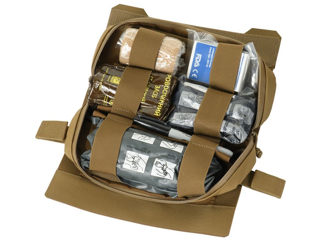 Inside the first aid kit, there is an organizer made of elastic bands for attaching first aid kits (not included). The front flap of the first aid pouch is equipped with an identifier in two colors - traditional for first aid kits, red or black, to make the pouch less conspicuous.