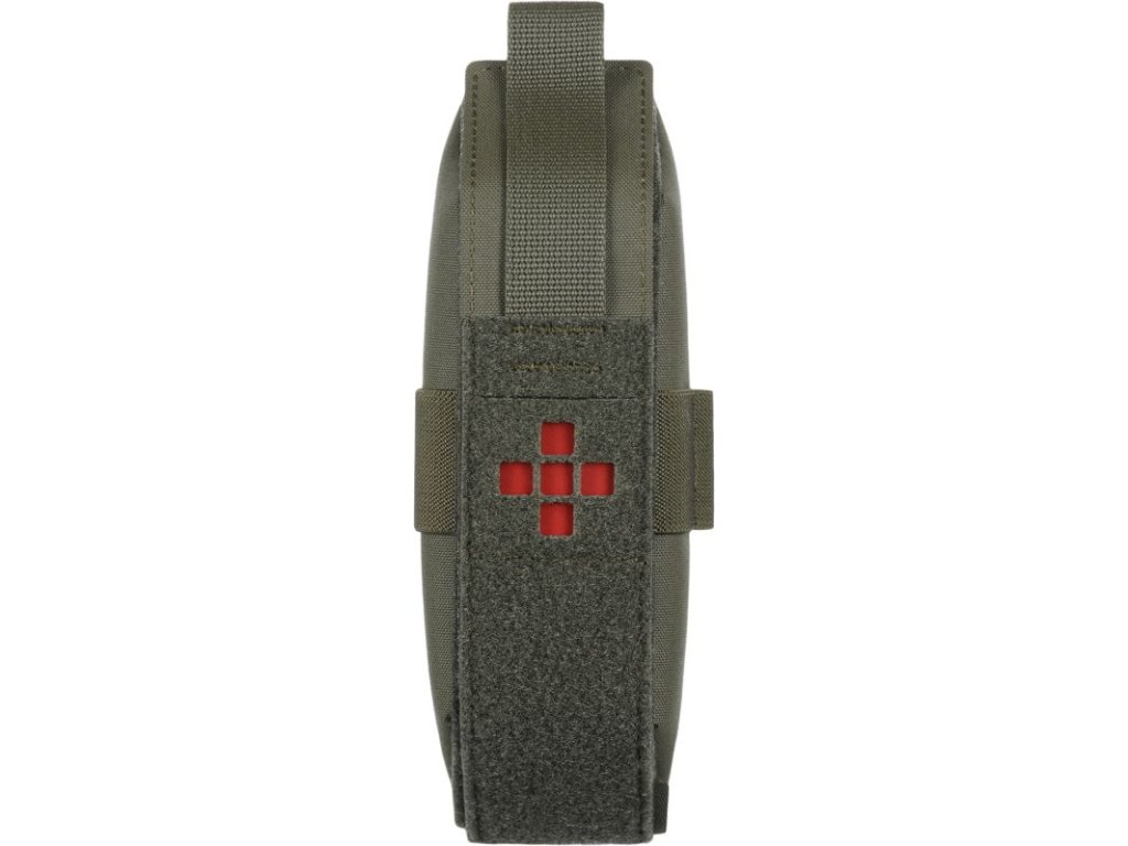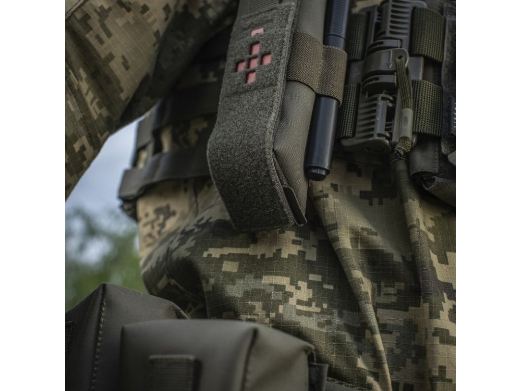 On the front flap, there is a loop for quick opening and easy access to the tourniquet. At the bottom, there is a special hook-and-loop patch that allows you to adjust the opening method: when secured, the pouch does not open completely, and the tourniquet is pulled out from the top; when the patch is tucked inside, the pouch opens completely, and the contents can be quickly removed. The front side also includes a panel with a "cross" symbol and space for identification patches, such as with blood type.