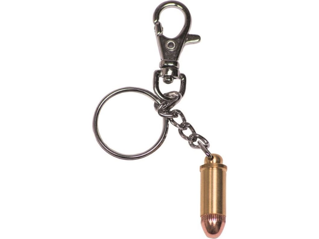 Stylish keychain in the shape of a 9mm Luger bullet.
