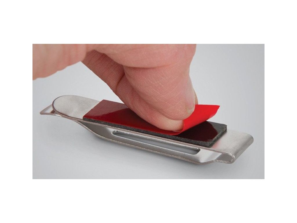 It attaches using patented VHB® tape, manufactured by the renowned company 3M®. Thanks to it, the clip can be securely attached to any flat surface, including a phone, pocket knife, camera, mp3 player, etc.