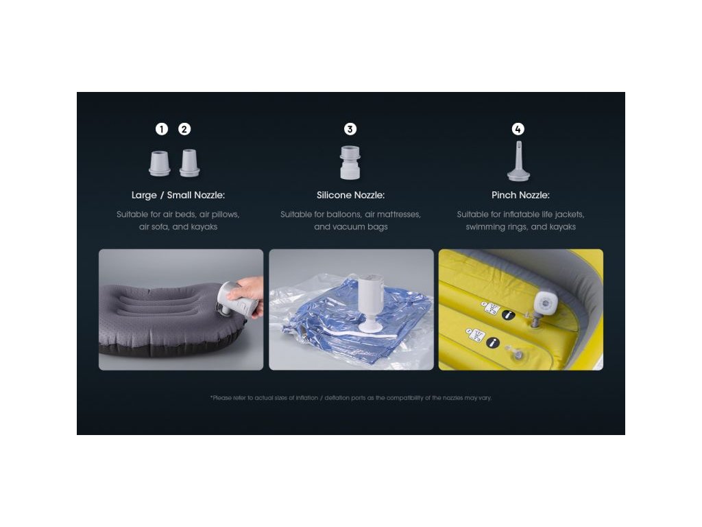 AP10 has a compact design with rounded edges, capable of producing a maximum air pressure of 4.5 kPa and a maximum airflow of 300 l/min. It also features a lighting mode with a maximum brightness of 300 lumens. It is equipped with 4 nozzles, which are compatible with various products needed for inflation or deflation.