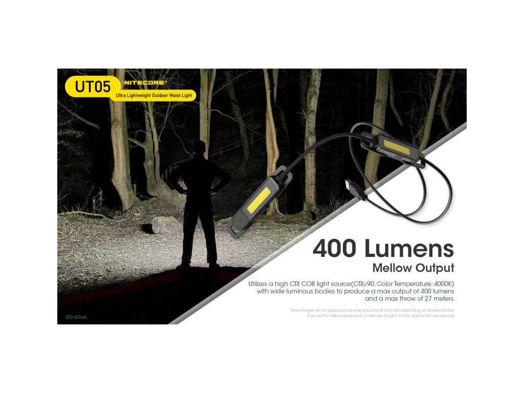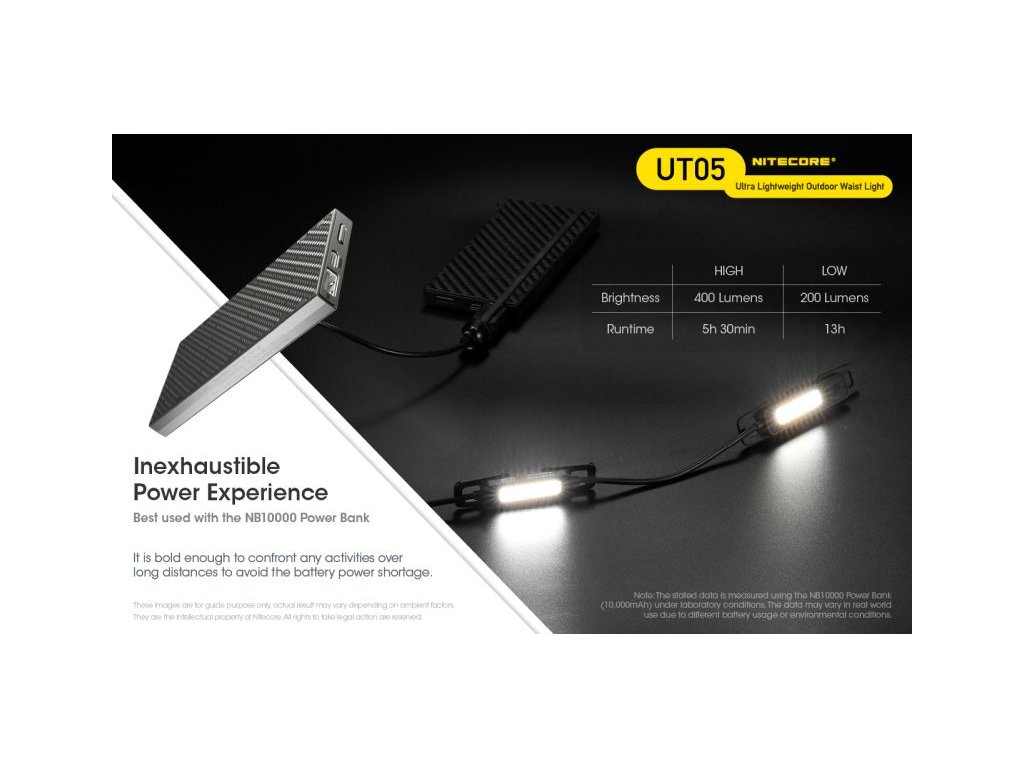» Powered by a power bank (not included) allowing performance up to 400 lumens.
