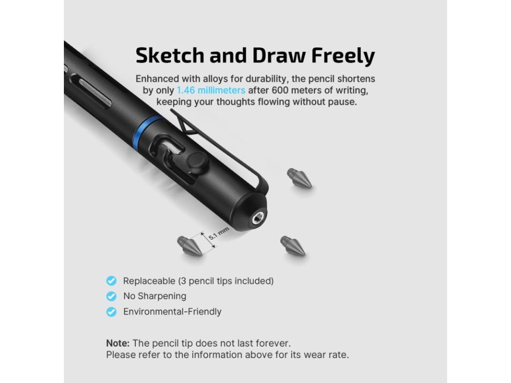 » Eternal pencil technology – replaceable metal-alloy tip with long lifespan (600 m writing ≈ 1.46 mm wear)