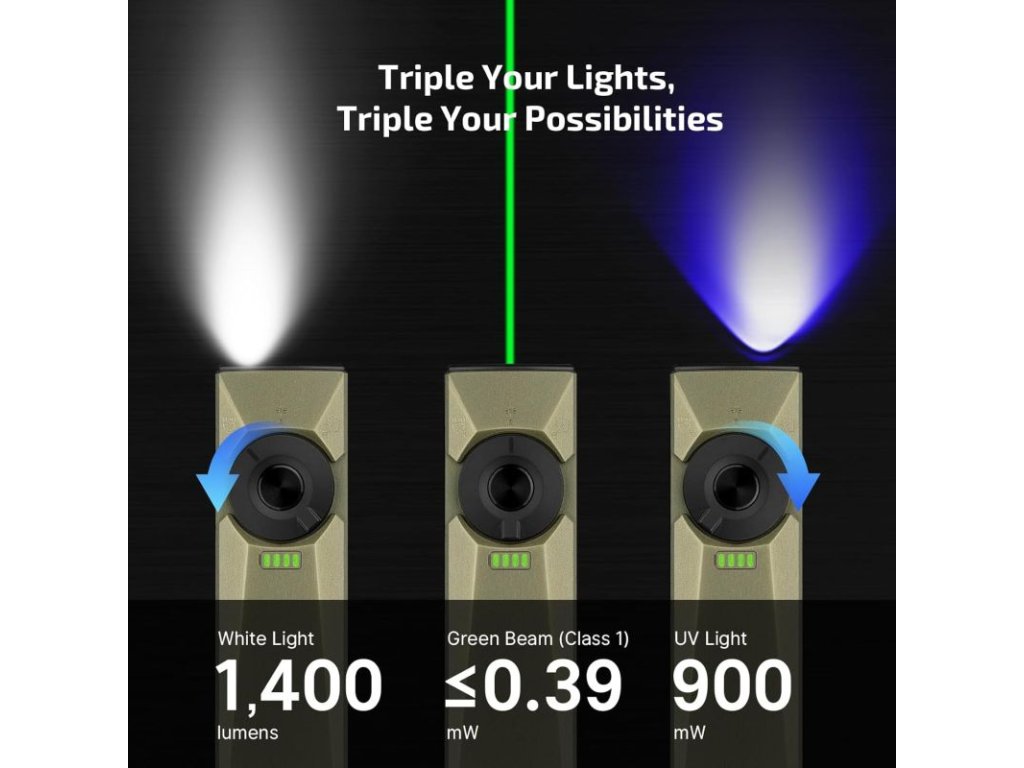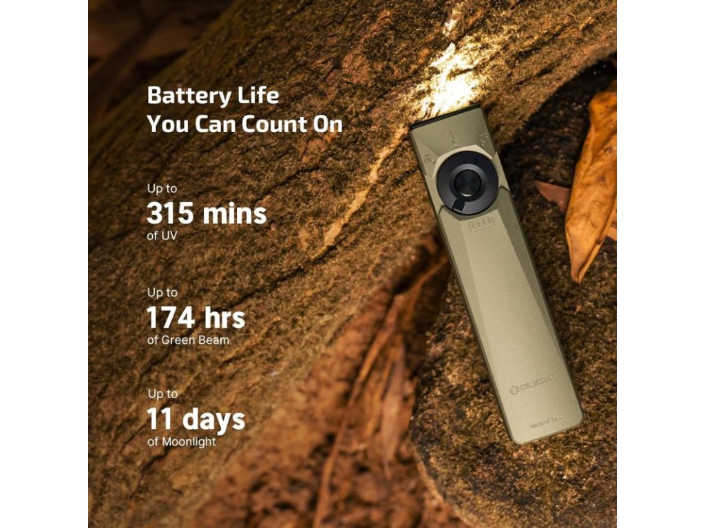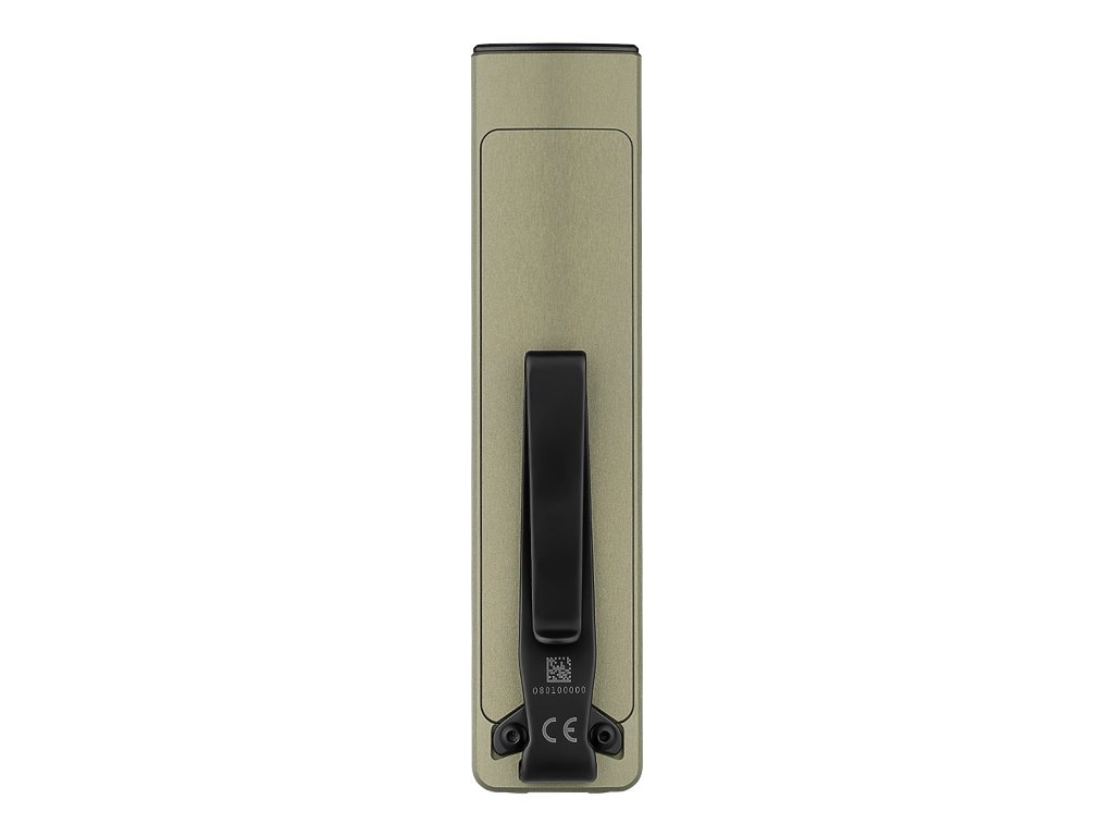 Maximum output of 1400 lumens illuminates every corner. You will appreciate the green laser, for example, at work during presentations or when entertaining pets. The powerful UV light with a wavelength of 900 mW is great for detecting counterfeit money, identifying minerals, and checking cleanliness. The overall design of the flashlight allows you to have it available anytime and anywhere, thanks to its interesting, flat design and pocket clip. Anti-slip strips and a striking mix of angular lines, sharp edges, and matte surface represent futuristic elegance. The flashlight meets the IPX7 standard and is resistant to continuous immersion up to a depth of 1.5 m. It is powered by a built-in 1500 mAh battery, which can be charged using the magnetic USB charger Olight MCC3, included in the package. Perfect features and interesting design make it an unbeatable choice for everyday use.