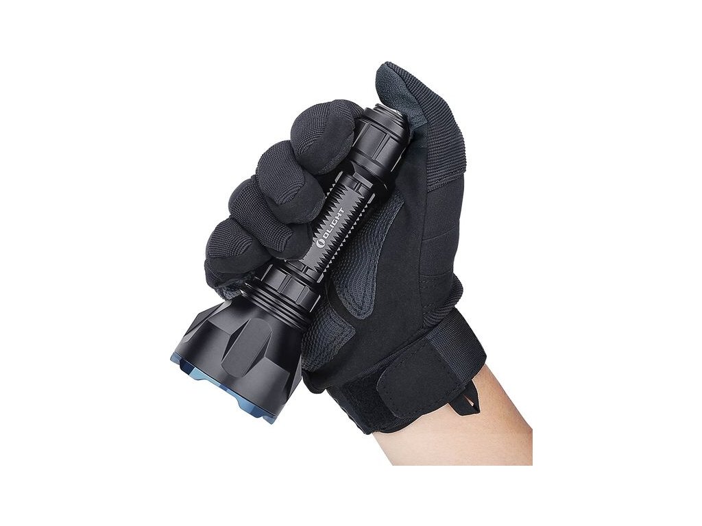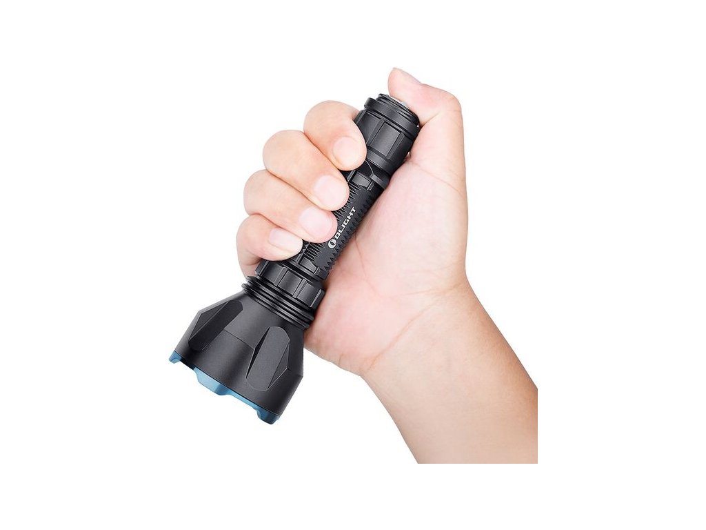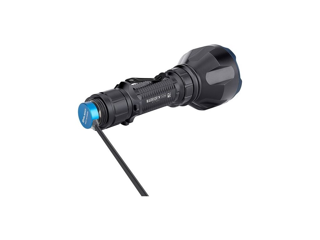 The switch on the back of the flashlight operates almost silently, allowing the flashlight to be used for tactical operations. The Warrior X Turbo model is powered by its own rechargeable 21700 battery, which can be charged directly in the flashlight using the magnetic USB charger Olight MCC3 2A (included). These batteries are characterized by stable operation in a wide range of temperatures, and they do not show a tendency to self-discharge (10-year lifespan), making them an ideal choice for military, police, and rescue operations. The hunting LED flashlight informs you of a low battery level with repeated vibrations.