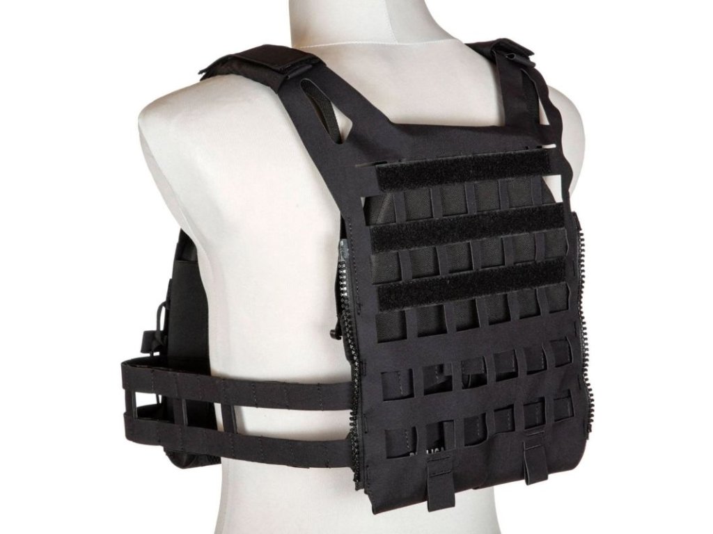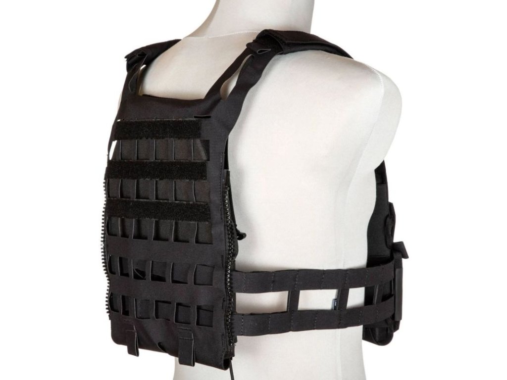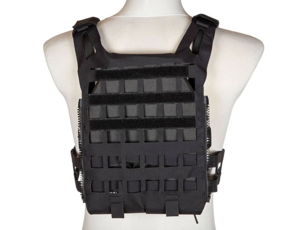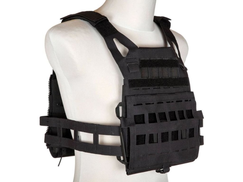 The black color and clean design make it suitable for use in various conditions – from airsoft games to training and professional tactical use. The vest is equipped with a front and rear platform with MOLLE webbing, allowing for individual configuration of pouches, holsters, or accessories. It also includes space for ballistic or training plates.
