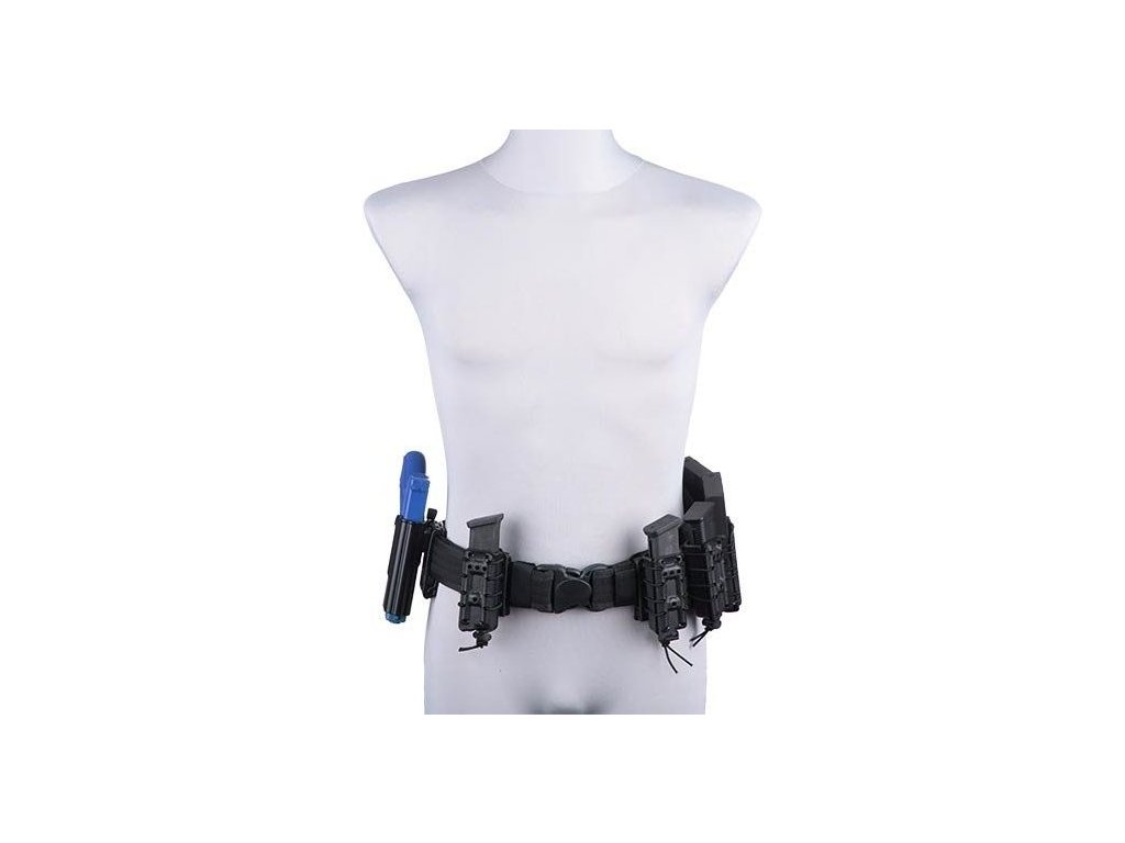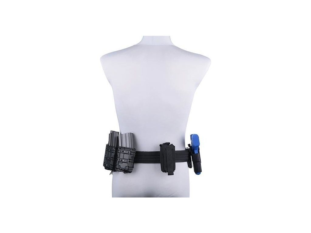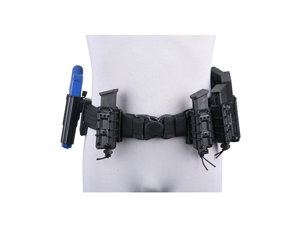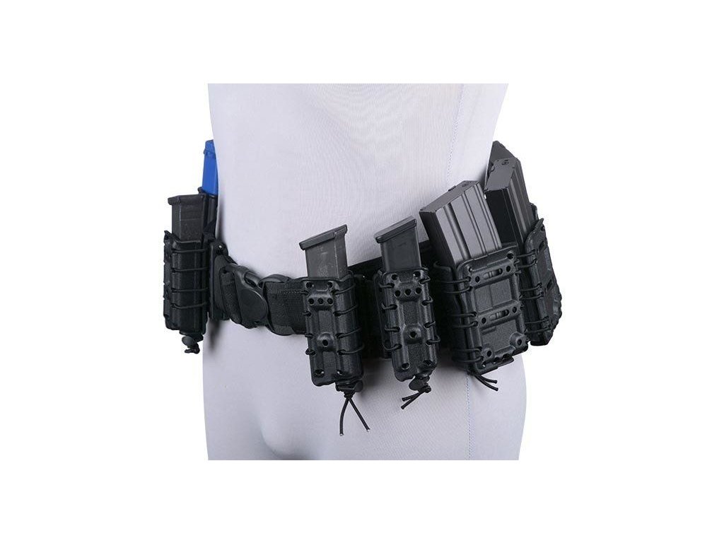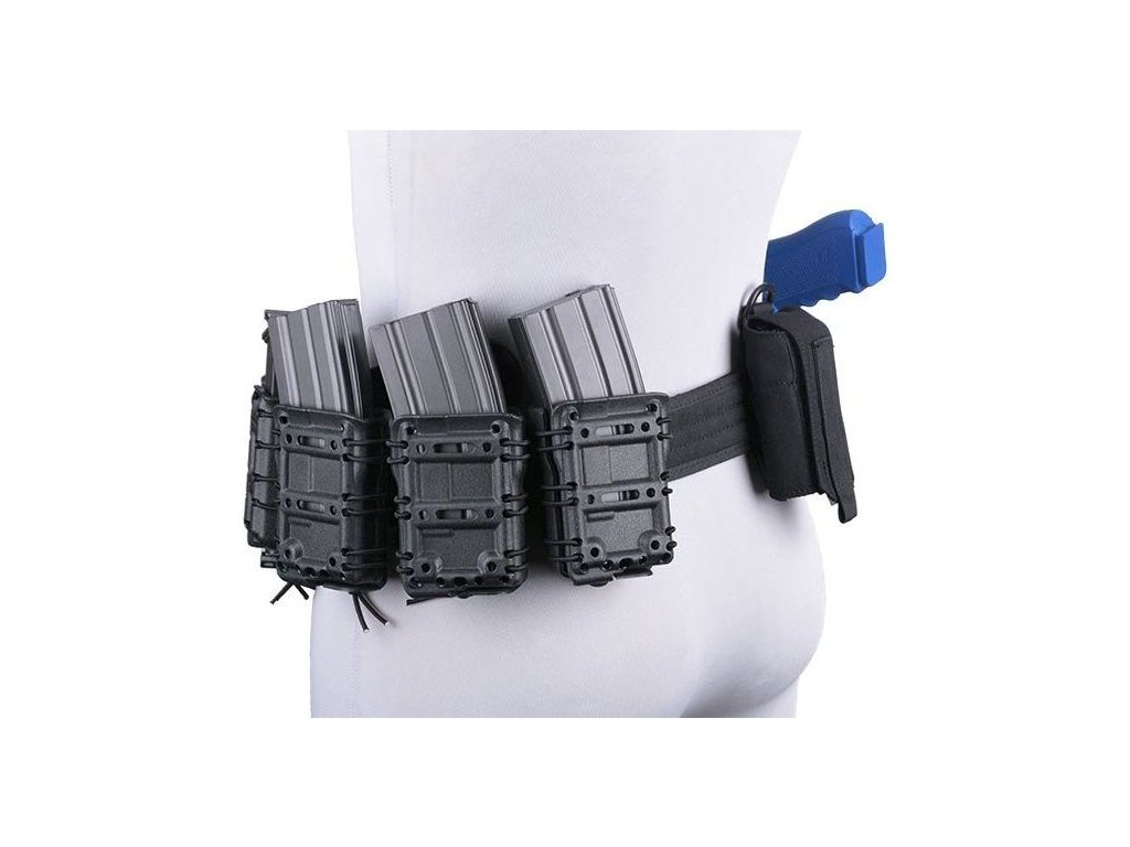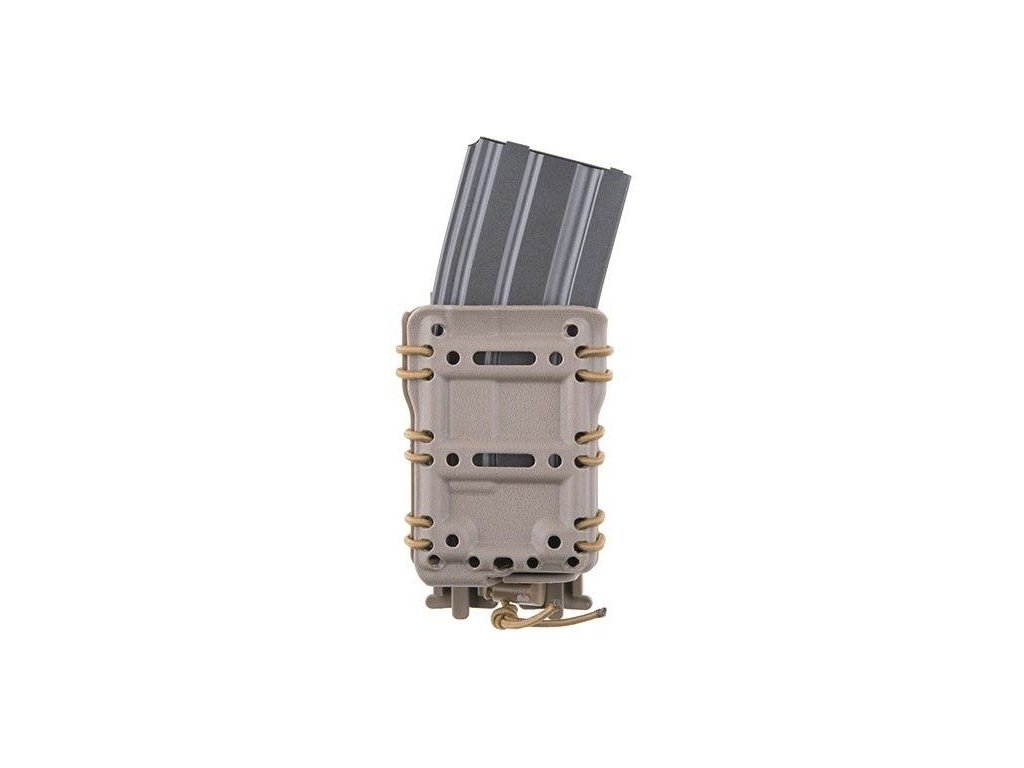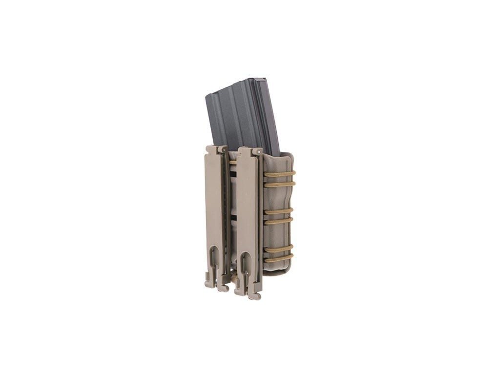 The self-locking pouch is made from durable polymer and is designed for cal. 5.56 magazines. The magazines are held self-lockingly so that they do not fall out even if they are upside down. The construction of the pouch consists of two halves, connected by an elastic rubber.