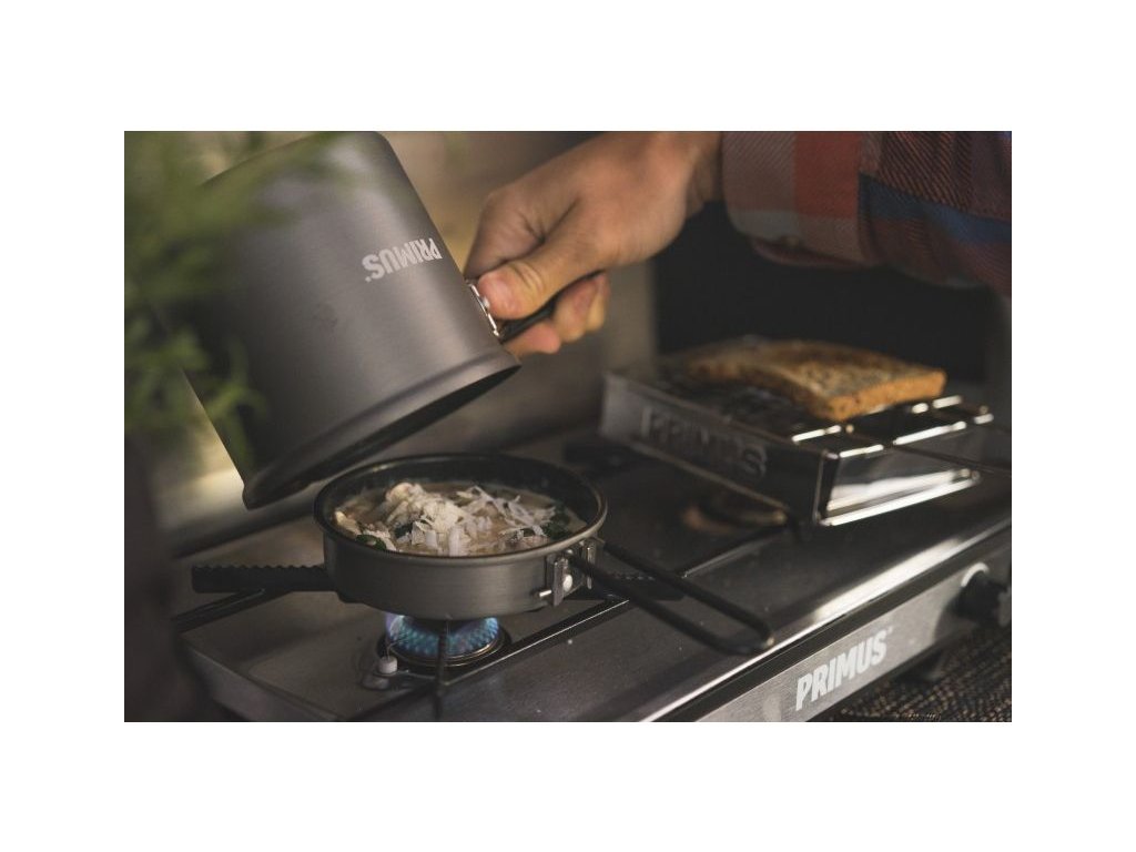 The Primus LiTech Trek Kettle set is ideal for outdoor activities, such as camping, hiking, or trips into nature. This practical set consists of a pot with a capacity of 1 liter and a pan, which also serves as a lid. It is made of anodized aluminum, ensuring high durability and low weight.