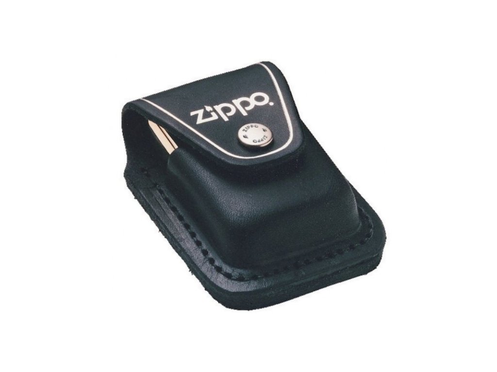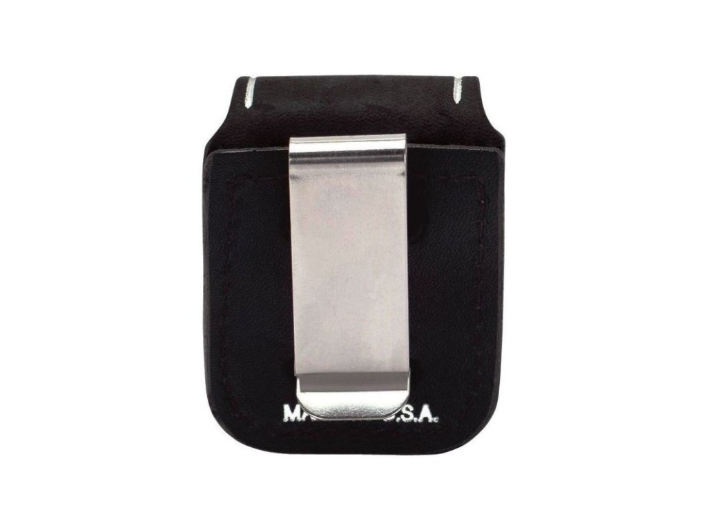 Black leather case for Zippo lighter with metal clip for hanging on a belt.