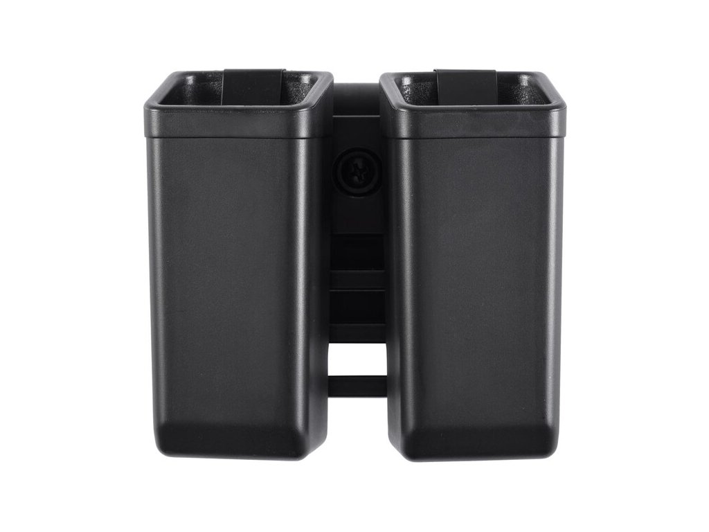 Plastic rotating holster for two double-row magazines for cal. 9 mm Luger with a fixing clip type UBC-03, which allows the holster to rotate 360 degrees.