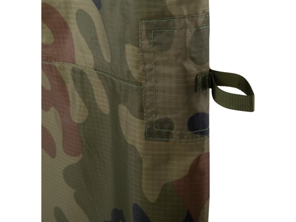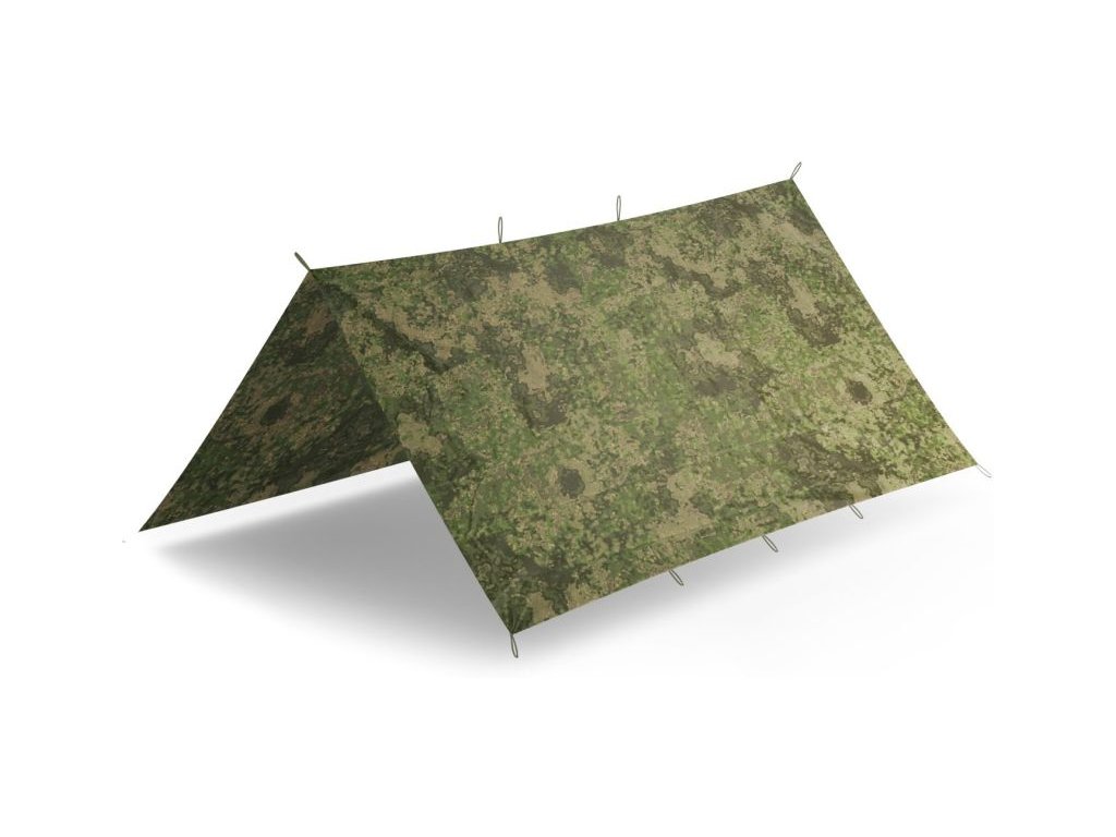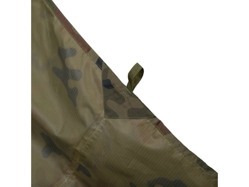 Universal tarp with 19 attachment points provides endless selection of possible uses for all terrains and climates. Reinforced attachment points and taped seams ensure durability and sealing. The zippered cover allows easy packing, even when wet. Eight straps allow attachment to a backpack, saving internal capacity. The tarp is made of polyester with RIP STOP treatment against tearing.