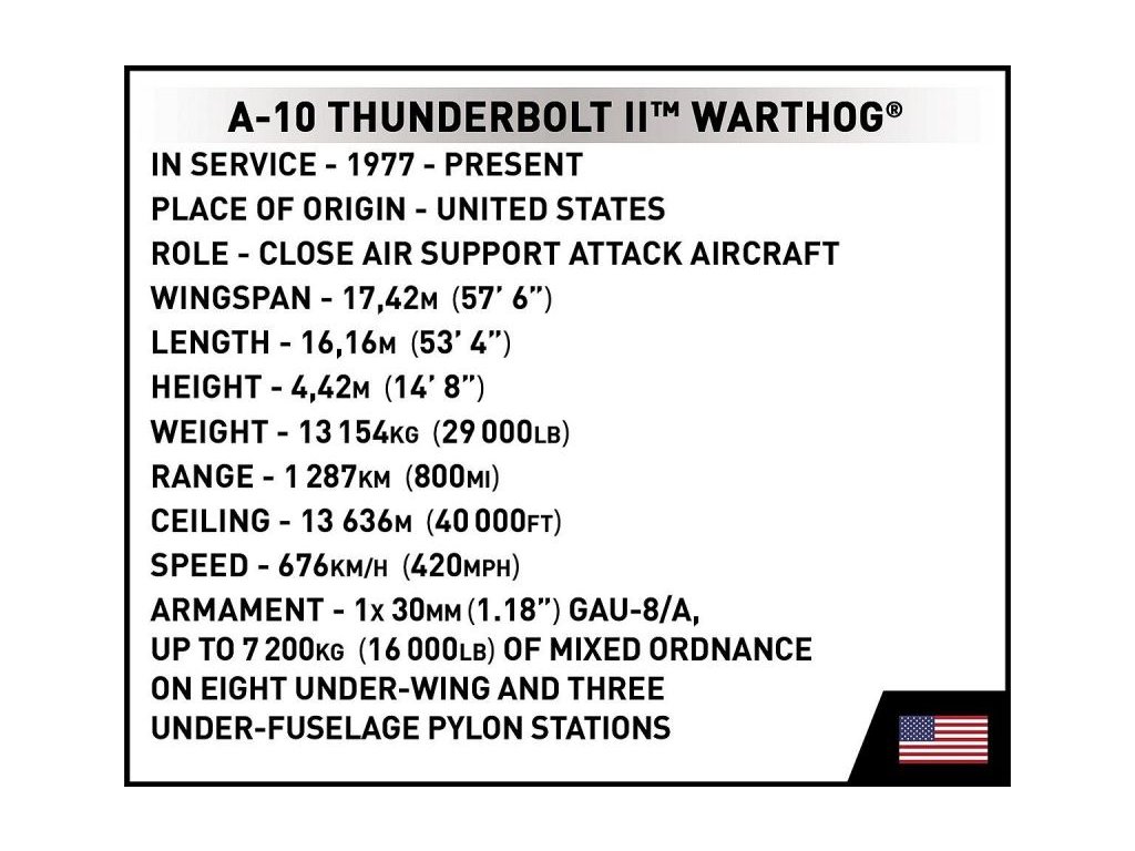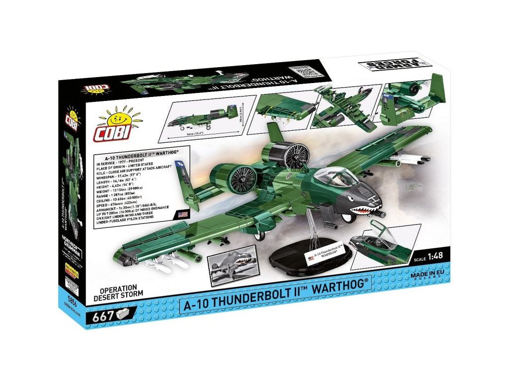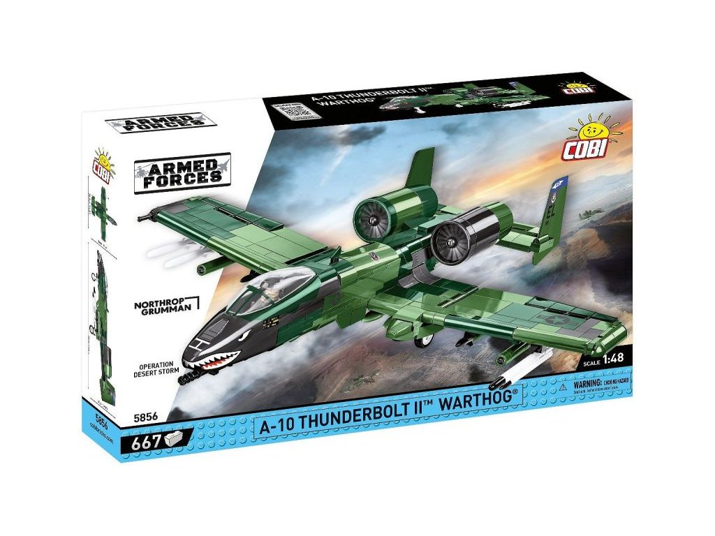 Az amerikai Fairchild A-10 Thunderbolt II közvetlen tűztámogató szubszonikus repülőgép modellkészlete az USAF 74. harccsoportjának álcázásában a Sivatagi Vihar hadművelet idejéből. Az összeszerelt modell nyitható pilótafülke-fedéllel rendelkezik, amelybe speciálisan kialakított pilótafigura ültethető, állítható vezérsíkokkal és behajtható futóműszárral. A szárnyak alatti felfüggesztéseken Sidewinder rakéták és bombák vannak rögzítve. Az összeszerelt modell saját futóművén állhat, vagy a csomag részét képező leírással ellátott állványon. A készlet a Northrop Grumman hivatalos licencével készült.