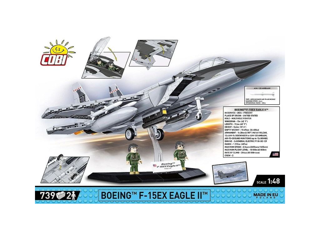 Ez az építőkészlet egy modern amerikai többcélú vadászrepülőgépet, a Boeing F-15EX Eagle II-t mutatja be 1:48 méretarányban. A modell állítható vezérsíkokkal, levehető futóművekkel és nyitható pilótafülke-fedéllel rendelkezik, ahol két pilótafigurát lehet elhelyezni repülős egyenruhában. A szárnyak alatt AMRAAM rakéták és kiegészítő üzemanyagtartályok találhatók.