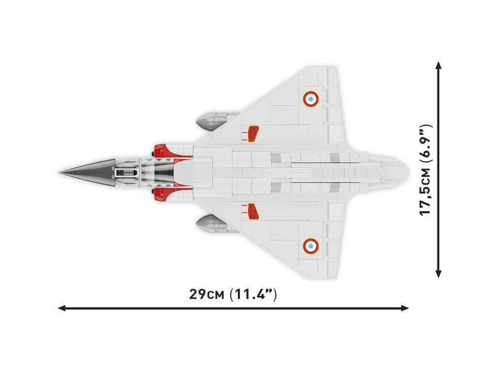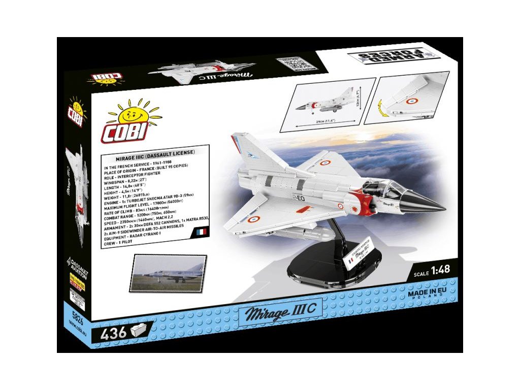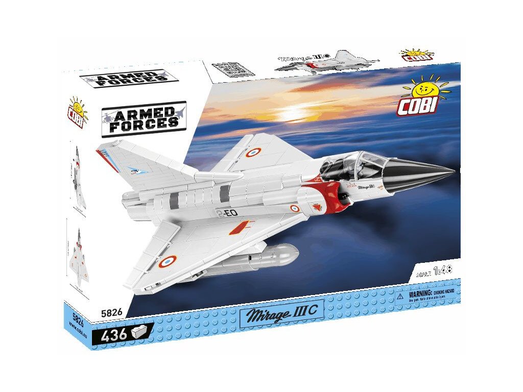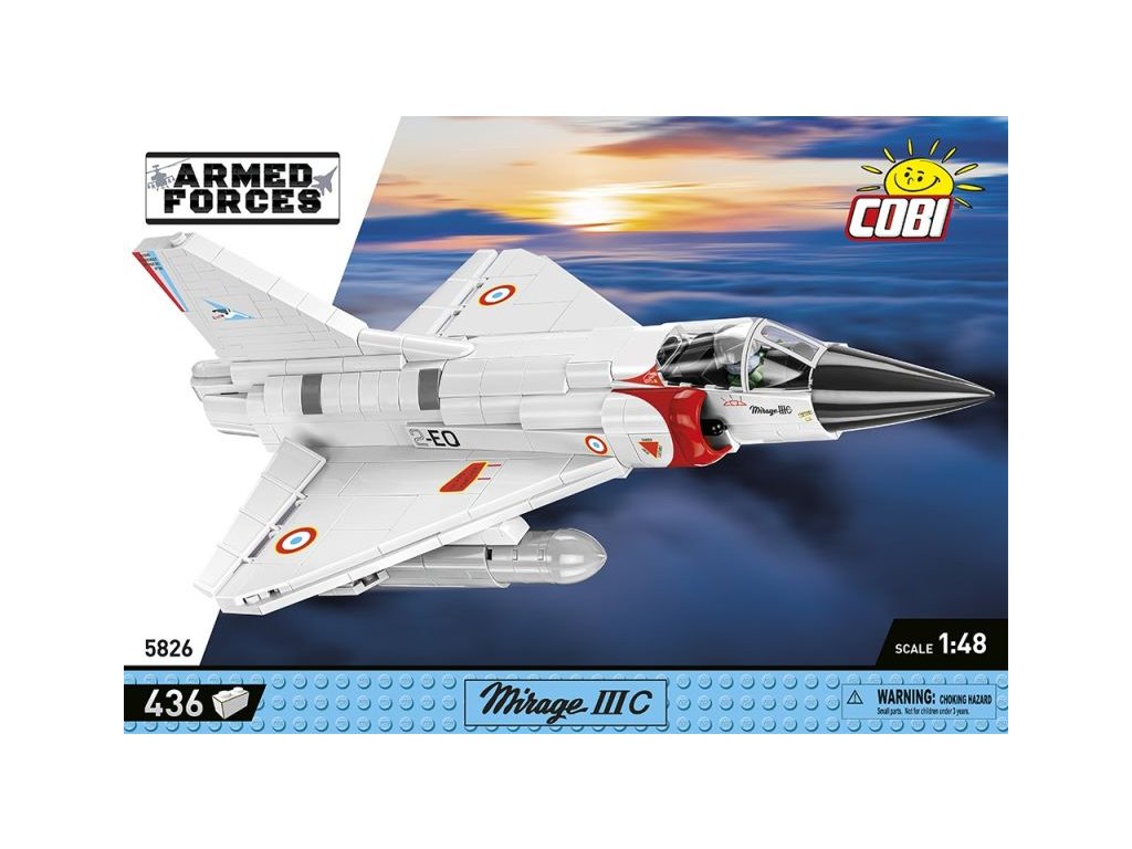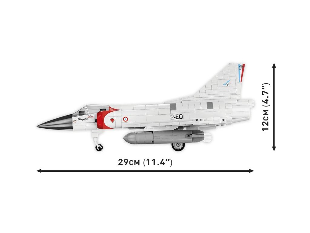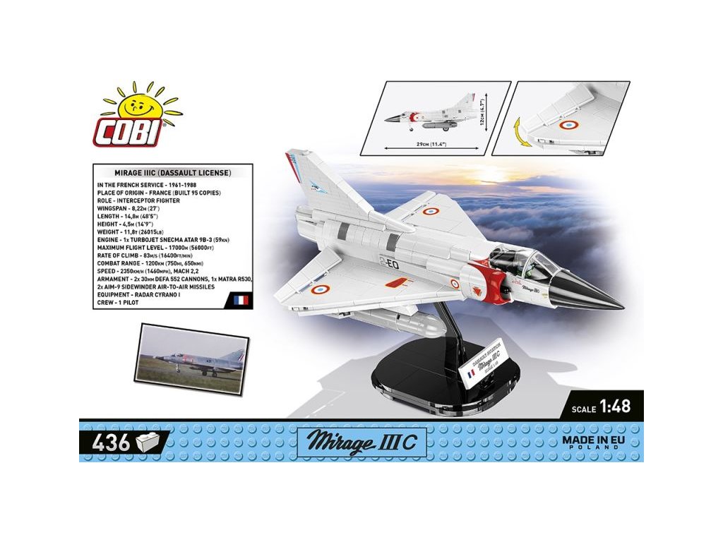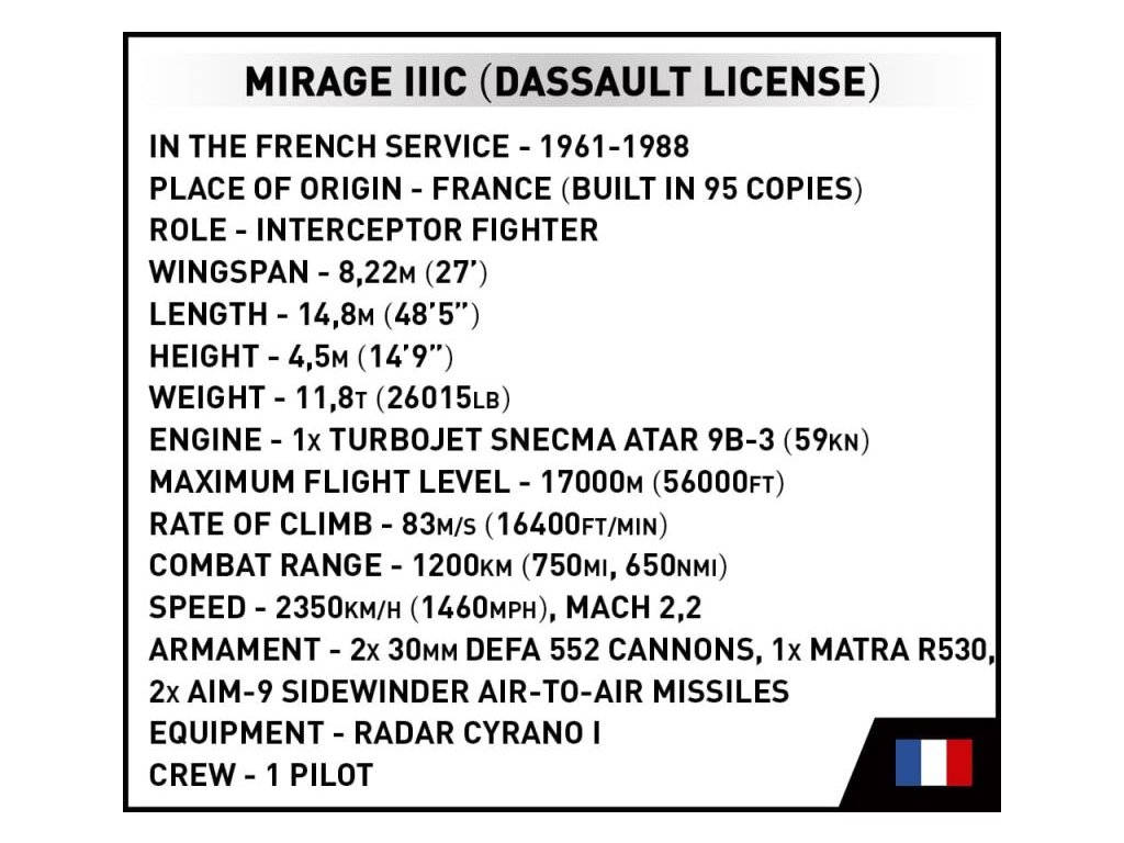 A francia Mirage IIIC szuperszonikus vadászrepülőgép építőkészlete a francia 01/002 CIGOGNES század álcázásában. A modell állítható vezérlőfelületekkel és speciálisan kialakított pilótafigurával rendelkezik, aki a pilótafülkében ül. További két tartály van a szárnyak alatt felfüggesztve. Az összeszerelt modell saját futóművén vagy a csomagban található címkés állványon állhat.