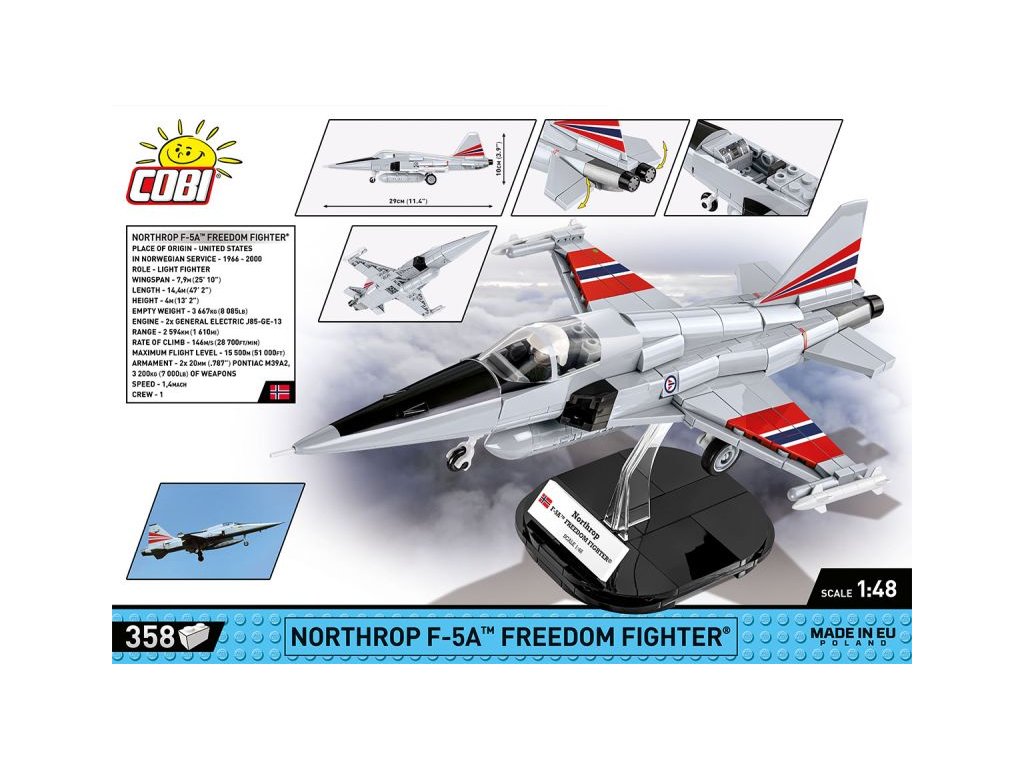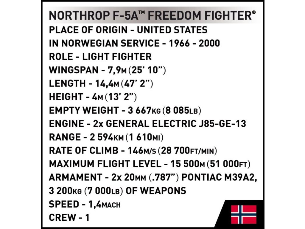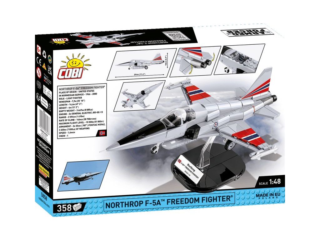 Az amerikai F-5A vadászrepülőgép modellje norvég légierő színeiben. A modell állítható hátsó vezérsíkokkal, levehető futómű lábakkal és speciálisan kialakított figurával rendelkezik, amely a pilótafülkébe helyezhető. A törzs alatt egy kiegészítő üzemanyagtartály van felfüggesztve. Az összeszerelt modell saját futóművén vagy a csomagolás részét képező leírással ellátott állványon állhat. Az 1:48 méretarányú modellek ugyanazt az örömet nyújtják, de több helyet foglalnak a polcon. A modell a Northrop Grumman hivatalos engedélyével készült.