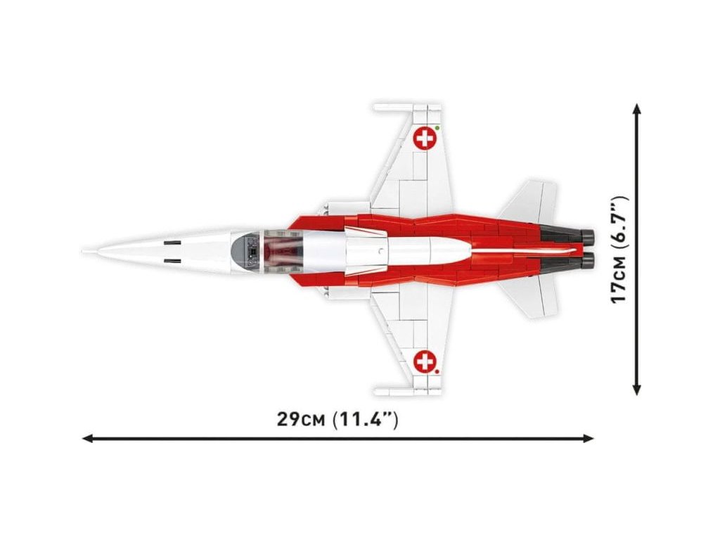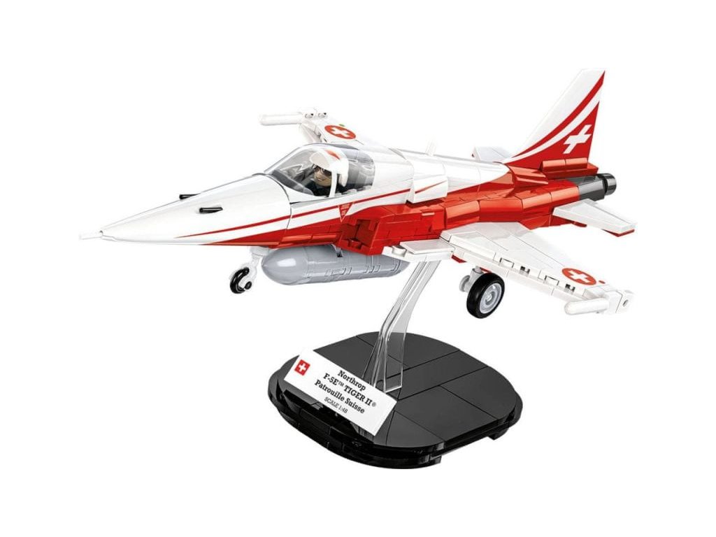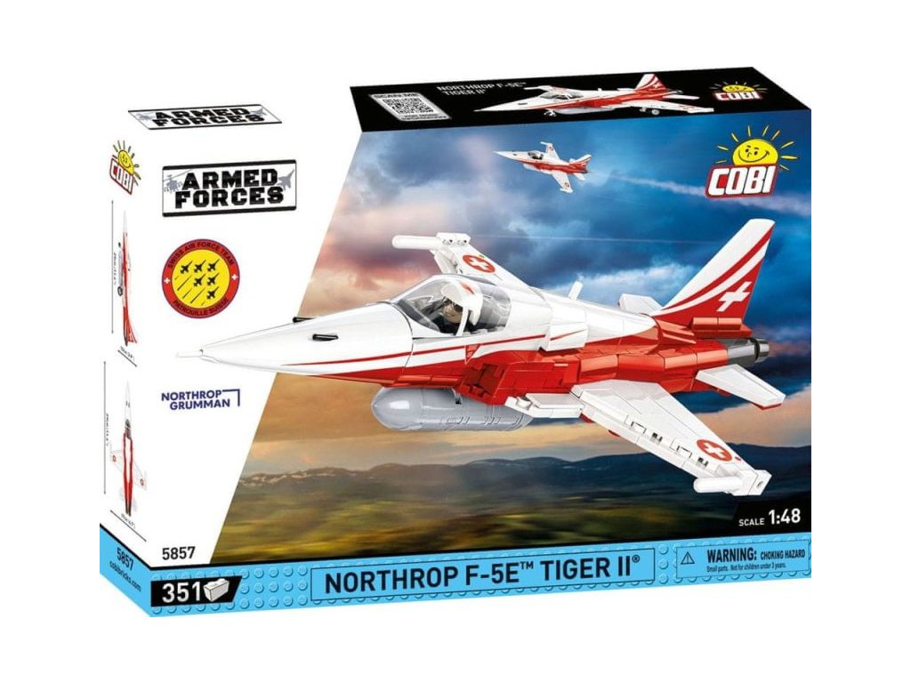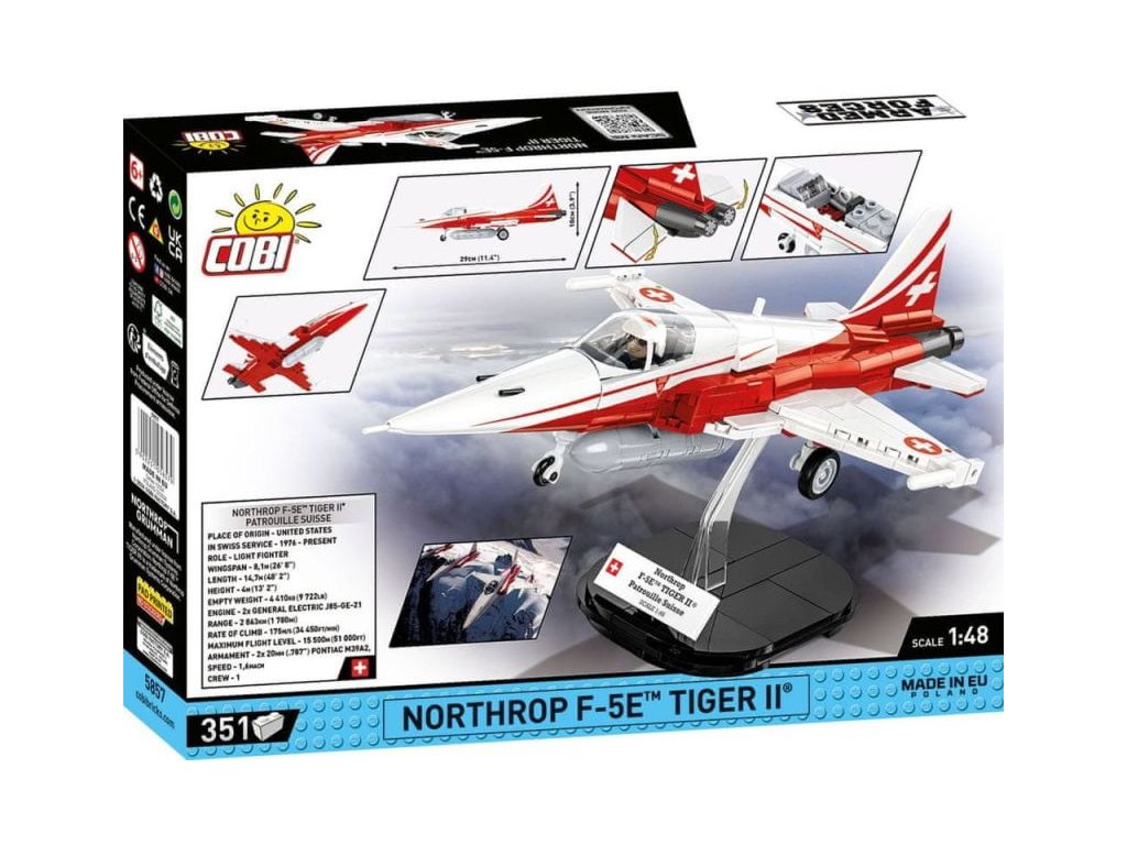 Építse meg a Northrop F-5 Tiger II modellt, egy könnyű szuperszonikus kétmotoros vadászgépet, amelyet az amerikai Northrop Corporation fejlesztett ki. A 20. század 70-es éveiben Svájc vásárolta meg ezeket a repülőgépeket. A repülőgépek kiváló manőverezhetőségükről és egyszerű irányíthatóságukról ismertek. Az F-5 1995-ben lépett szolgálatba a svájci légierő Patrouille Suisse csapatánál. Koruk ellenére a Tiger II még mindig lenyűgöző gépek, képesek dinamikus és látványos légi bemutatókat tartani. A Patrouille Suisse nemzetközi hírnevet szerzett hihetetlen pilótaképességei és lenyűgöző bemutatói révén, és az F-5 repülőgépek elválaszthatatlan részét képezik sikerüknek és elismerésüknek. A csomag 351 építőkockát tartalmaz, és a modell 1:48 méretarányú.