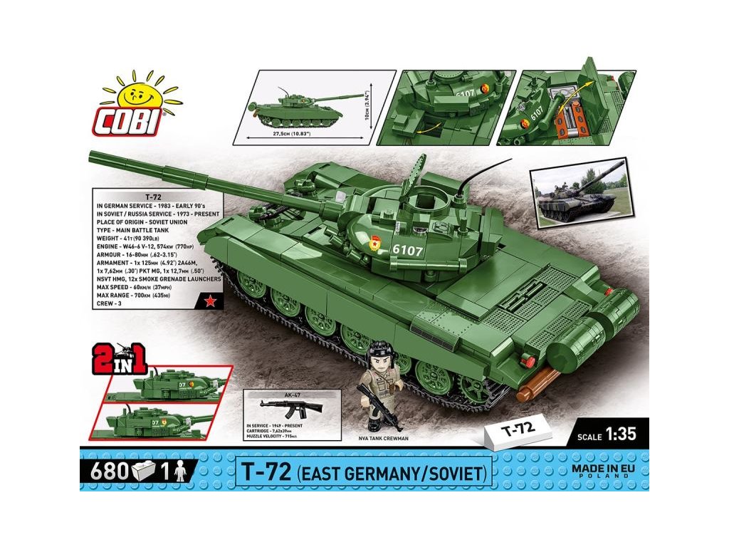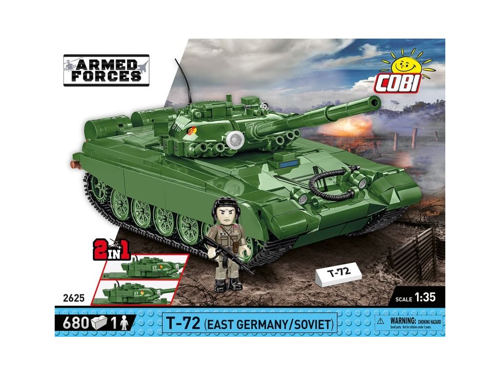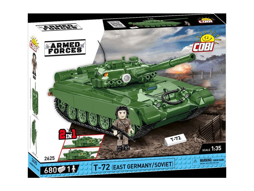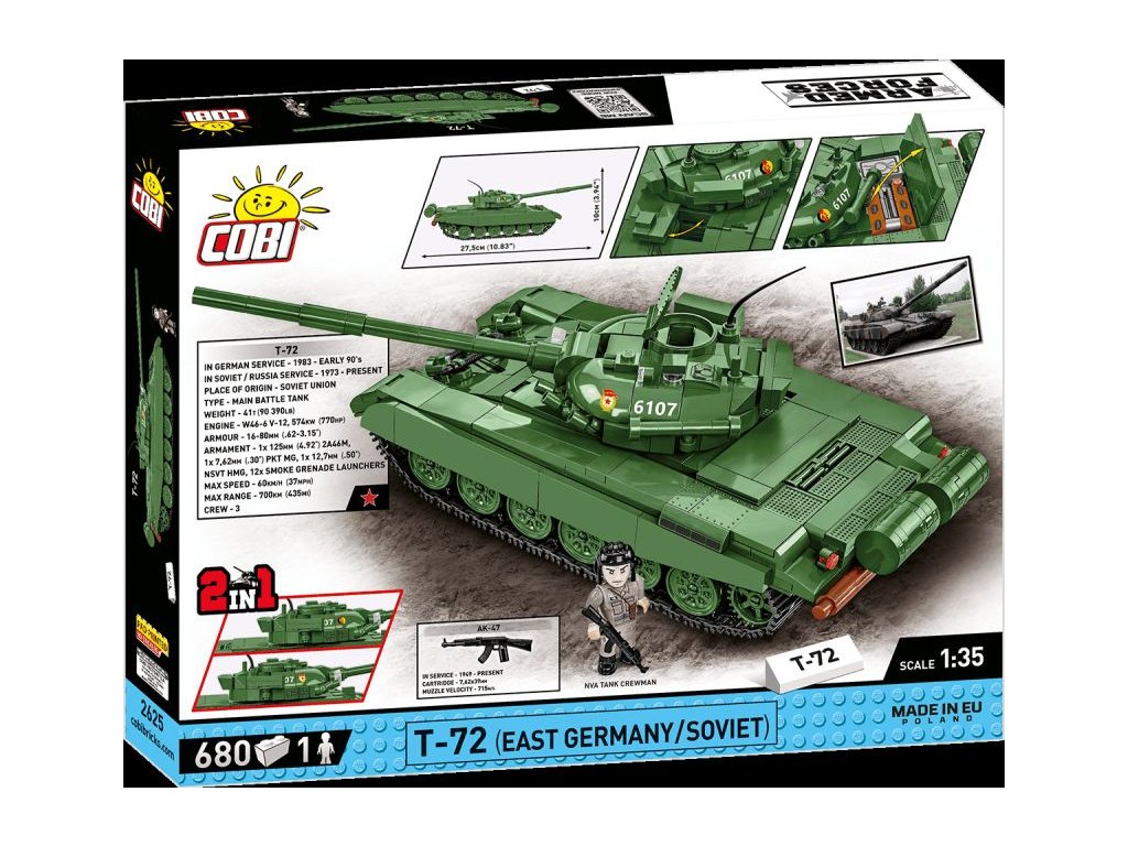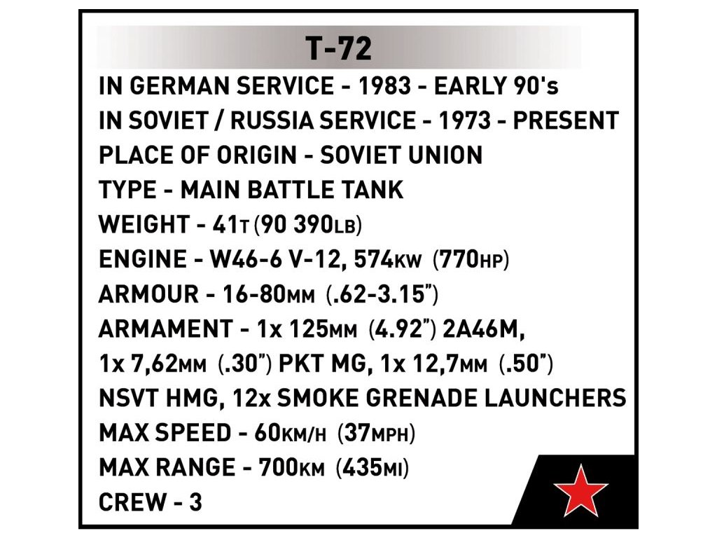 A T-72 közepes harckocsi modellje 1:35 méretarányban. Az összeszerelt modell forgatható toronnyal rendelkezik, állítható ágyúemelkedéssel, nyitható búvónyílásokkal és nyitható W46 motorfedéllel. A harckocsi lánctalpai működőképesek, és a modellel csúszásmentes felületen lehet gurulni. A 2 az 1-ben verziójú készlet tartalmaz kockákat a keletnémet demokratikus köztársaság és a Szovjetunió páncélos hadseregének jelvényeivel. A csomag része egy német tankista figura AK-47 géppisztollyal és egy feliratos kocka is.