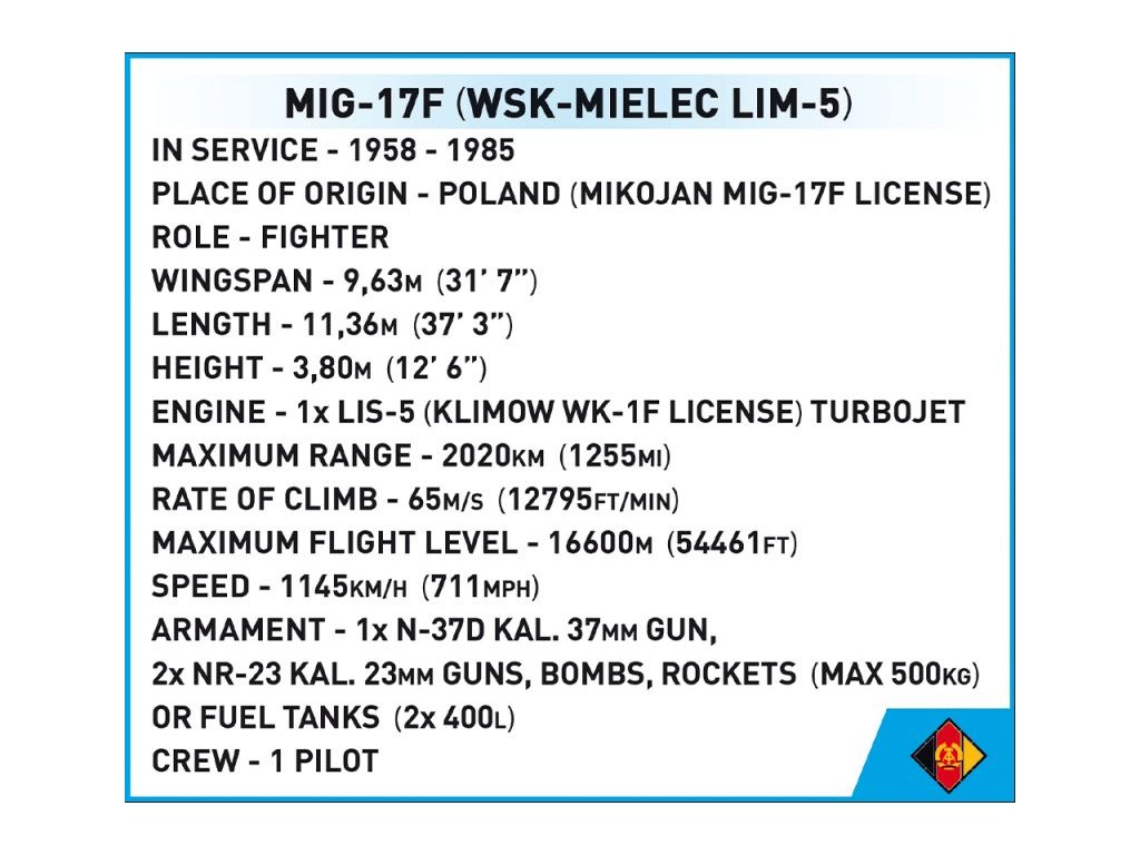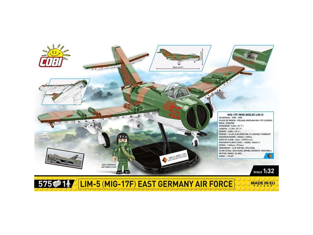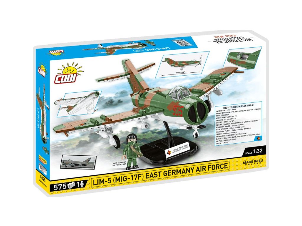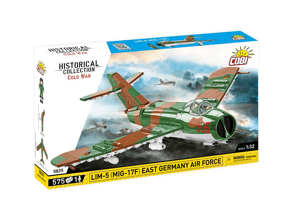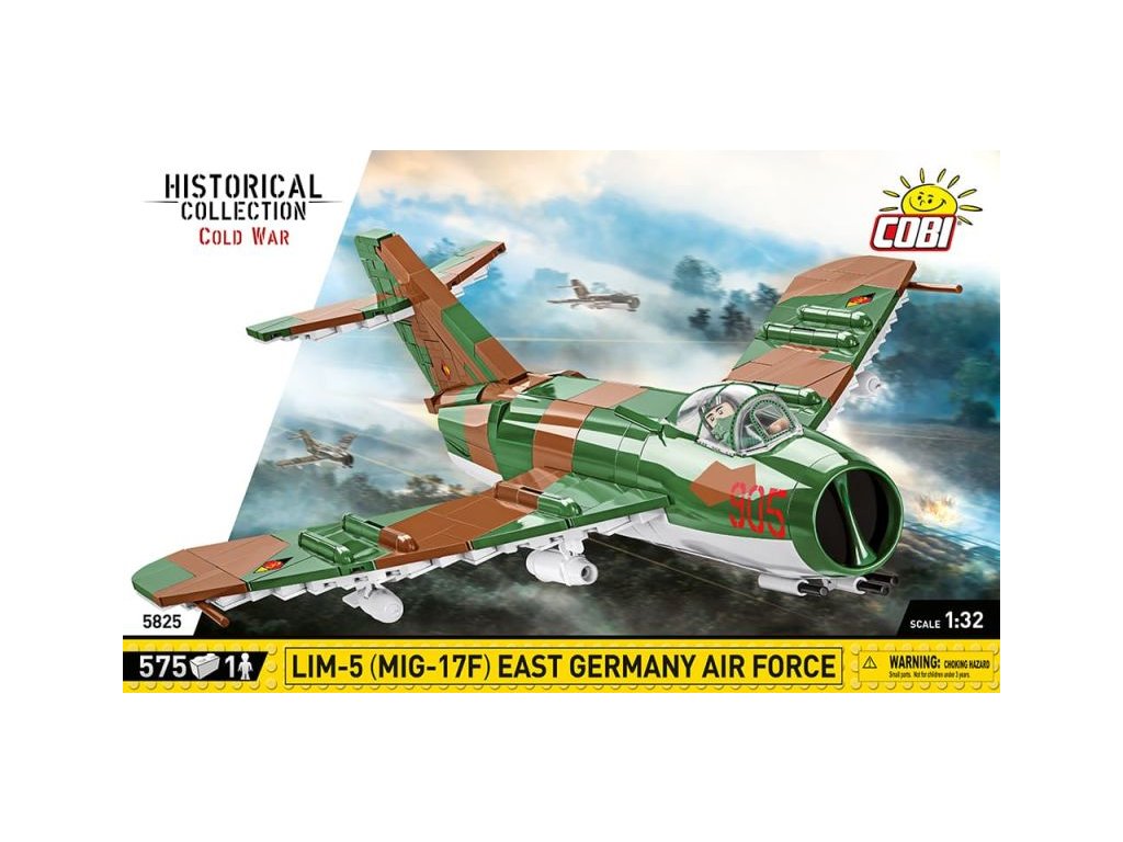 A keletnémet LIM-5 (MIG-17F) vadászgép építőkészlete NATO Fresco kódnévvel. Az összeszerelt modell levehető pilótafülke borítással rendelkezik, amely lehetővé teszi a pilótafigura egyszerű behelyezését. A modell saját futóművén vagy a mellékelt állványon állhat, amely leírással van ellátva. A modell kialakítása miatt a futómű lábai nem behúzhatók, de könnyen eltávolíthatók. A figura oxigénmaszkot visel, így sajnos nem tudjuk megállapítani, hogy van-e híres keletnémet bajusza.