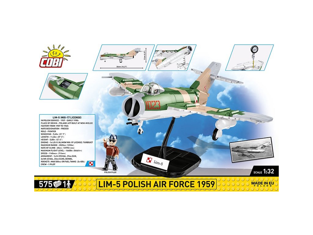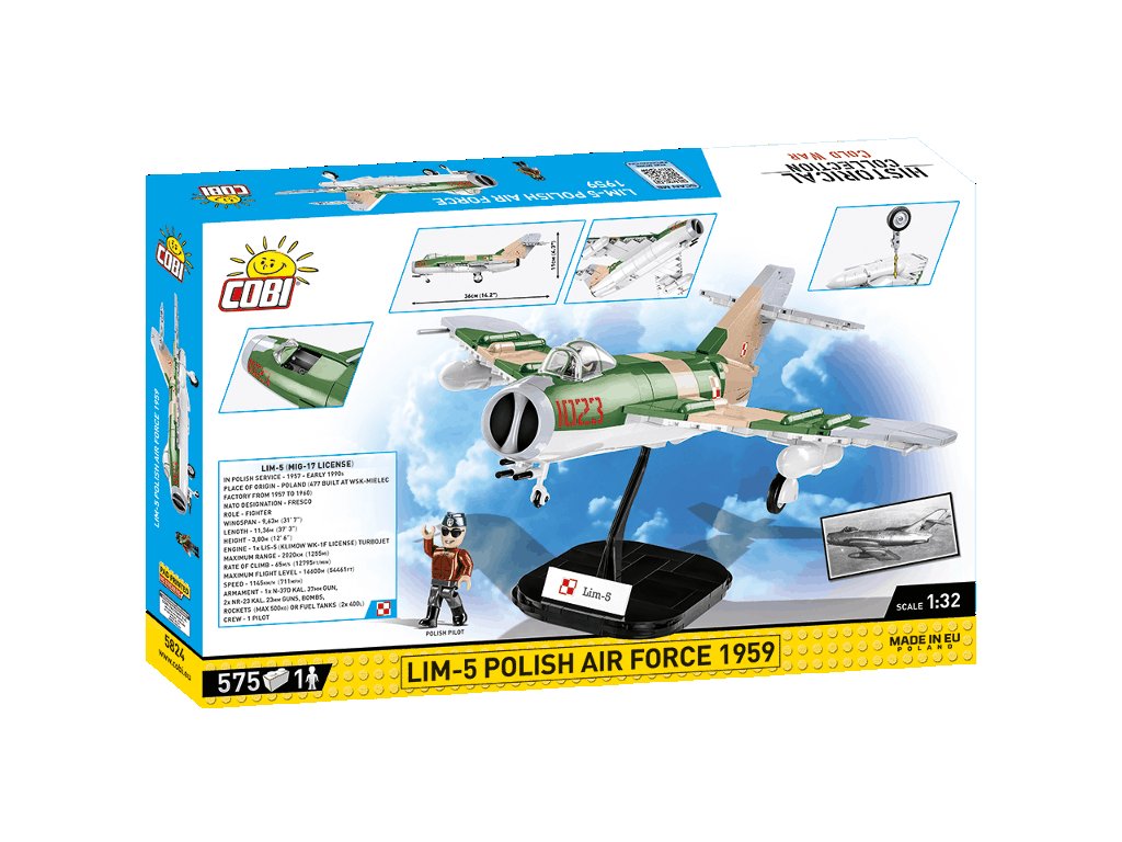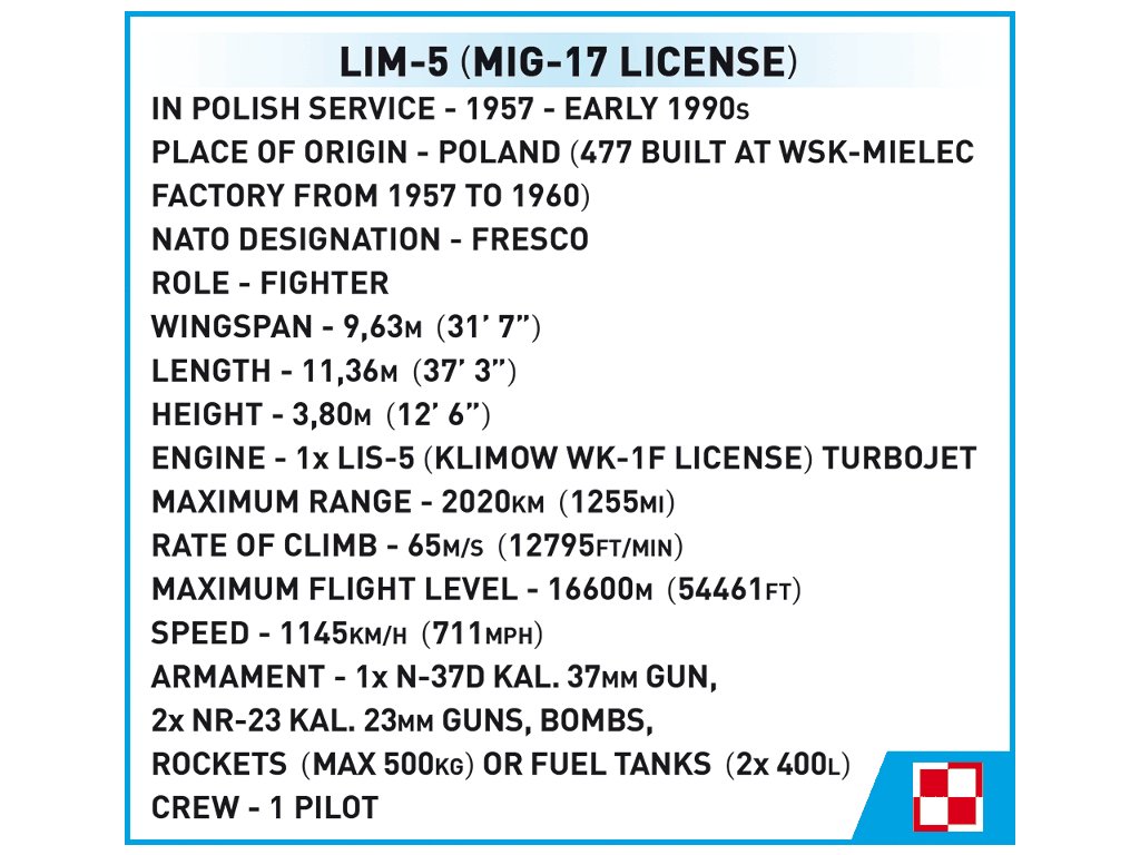 A lengyel LIM-5 (MIG-17F) vadászrepülőgép építőkészlete, NATO kódnévvel Fresco. Az összeszerelt modell levehető pilótafülke-fedéllel rendelkezik a pilótafigura egyszerű behelyezéséhez. A modell saját futóművén vagy a mellékelt állványon állhat, amely felirattal van ellátva. A modell kialakítása miatt a futómű lábai nem behúzhatók, de könnyen eltávolíthatók. A készlet tartalmaz egy lengyel pilóta figurát.