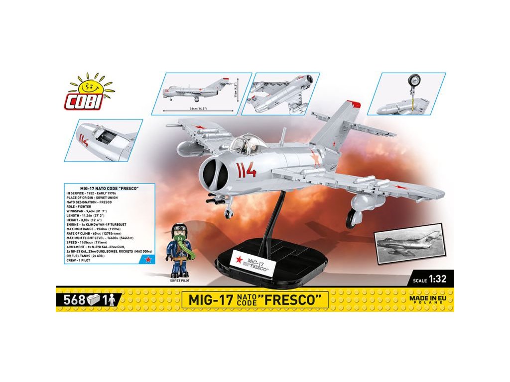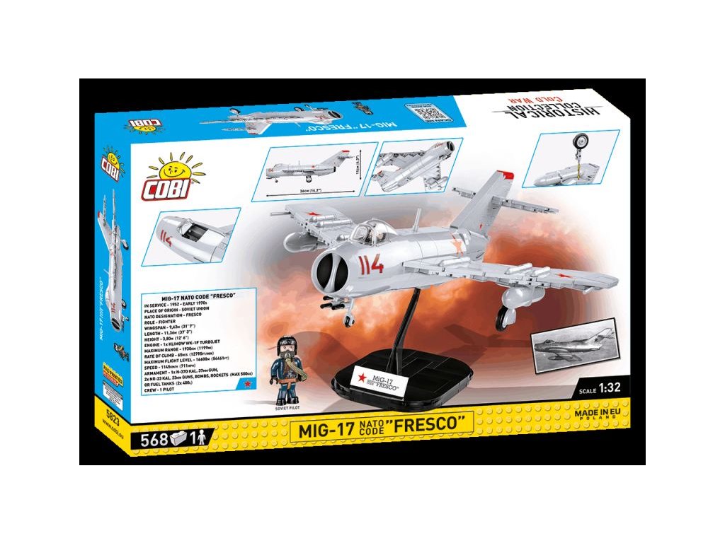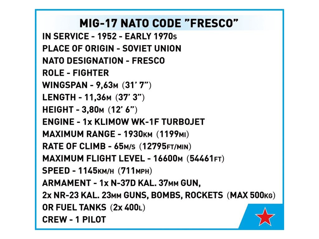 Az orosz MiG-17 vadászgép építőkészlete, NATO kódnévvel Fresco. Az összeszerelt modell levehető pilótafülke-fedéllel rendelkezik a pilótafigura egyszerű behelyezése érdekében. A kiegészítő üzemanyagtartályok a szárnyak alatt vannak felfüggesztve. A modell saját futóművén vagy a mellékelt állványon állhat, leírással. A modell kialakítása miatt a futómű lábai nem behúzhatók, de könnyen eltávolíthatók. Tartalmaz egy szovjet pilóta figurát is.