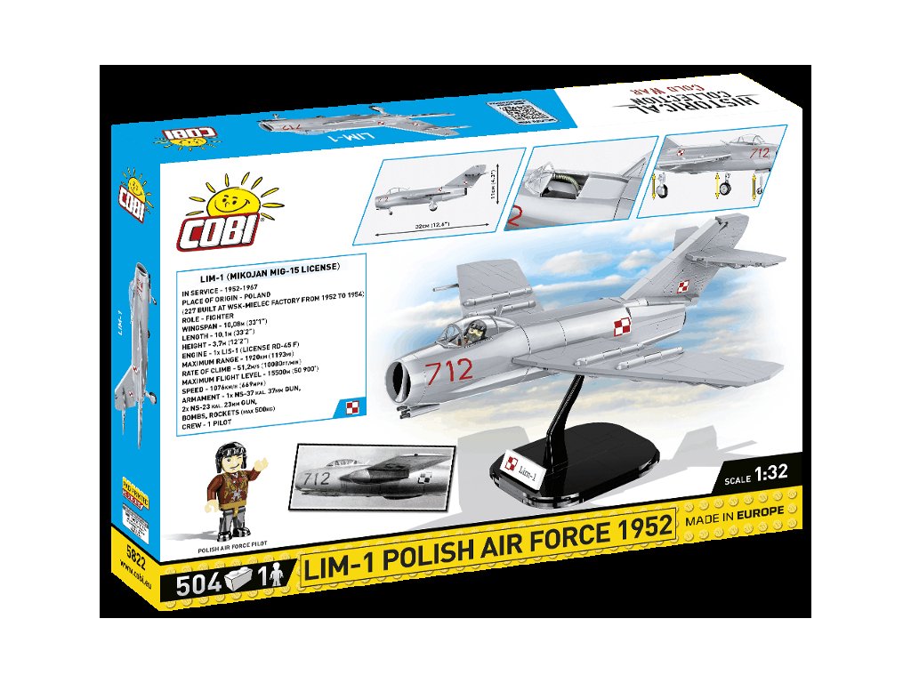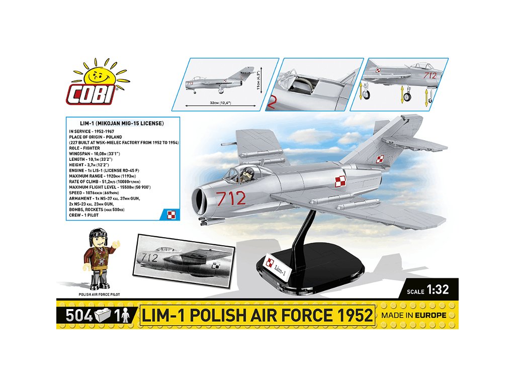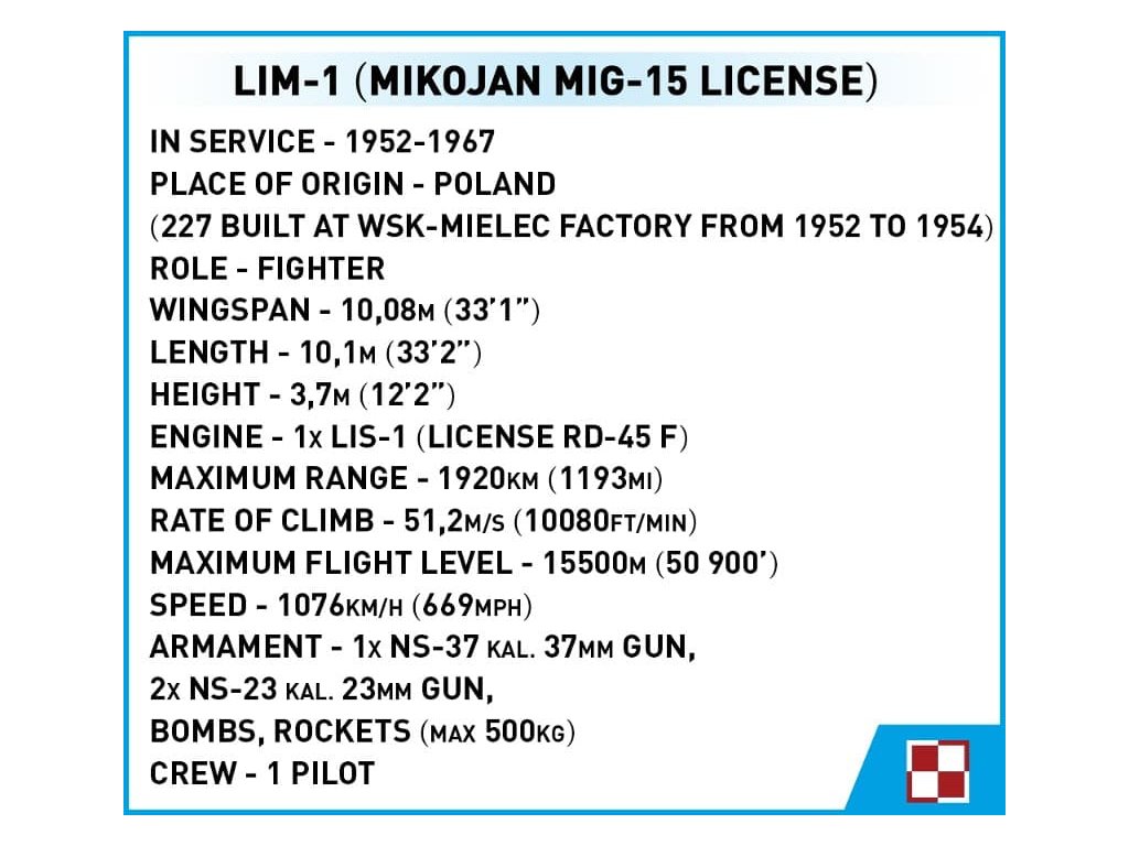A lengyel LIM-1 (MIG-15) vadászrepülőgép építőkészlete, NATO kódnévvel Fresco. Az összeszerelt modell levehető pilótafülke-borítással rendelkezik a pilótafigura egyszerű behelyezése érdekében. A modell saját futóművén vagy a mellékelt állványon állhat, leírással. A modell kialakítása miatt a futómű lábai nem behúzhatók, de könnyen eltávolíthatók. A készlet tartalmaz egy lengyel pilóta figurát.