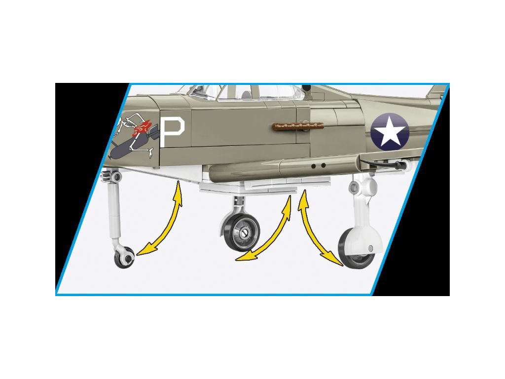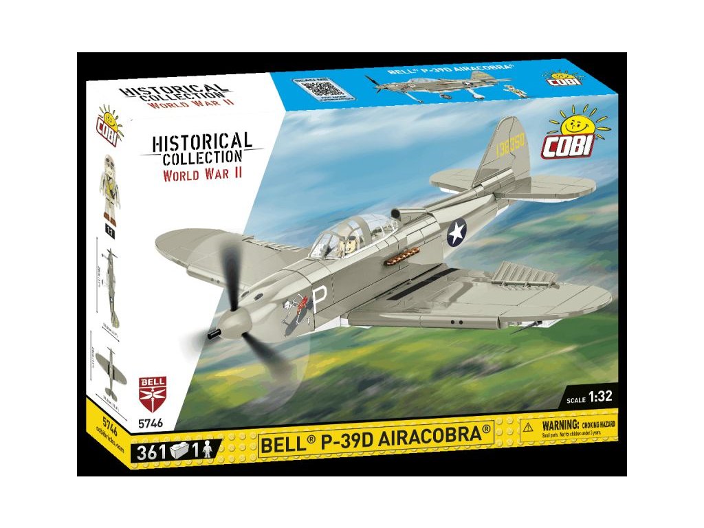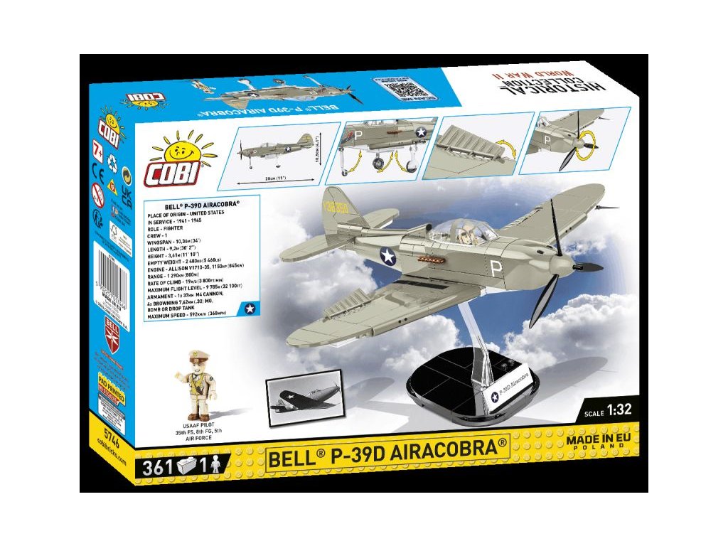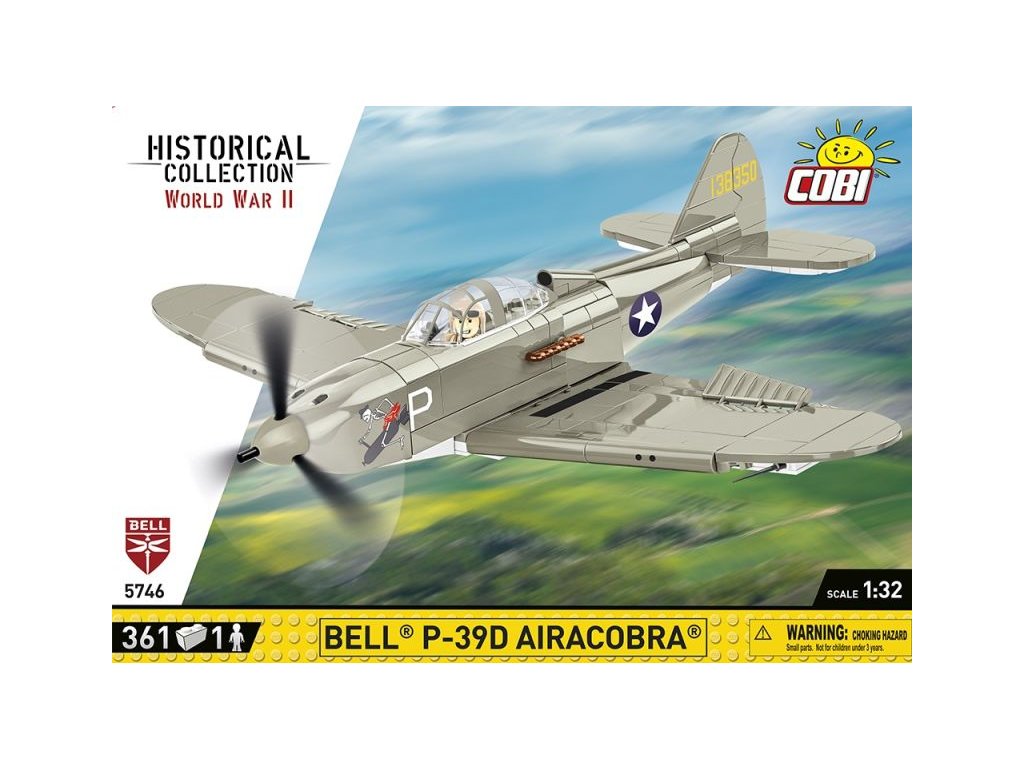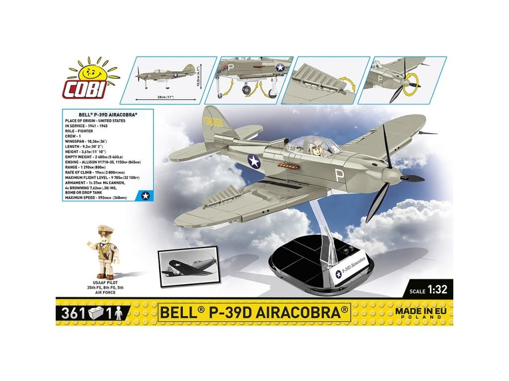 Az amerikai Bell P-39D Airacobra vadászrepülőgép szokatlan konstrukciójú építőkészlete az USAF 35. vadászcsoport színeiben. Az összeszerelt modell forgatható légcsavarral, állítható vezérsíkokkal és levehető pilótafülke-fedéllel rendelkezik, hogy a 8. század pilótafigurája, a Fekete Párducok becenévre hallgató, kényelmesen ülhessen. A modell saját futóművén állhat, vagy biztonságosan elhelyezhető a mellékelt állványon.