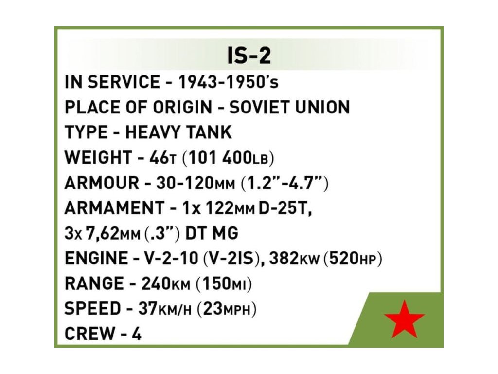 Az IS-2 tankot 1943-ban fejlesztették ki a Vörös Hadsereg korábbi nehéz tankmodelljeinek utódjaként. A legénysége 4 főből állt. Fő fegyverzete egy 122 mm-es ágyú volt, amely képes volt áttörni a legjobb német tankok, mint a Tigris és a Párduc páncélzatát. Az IS-2 fontos szerepet játszott a berlini csatában, ahol hozzájárult a Harmadik Birodalom végső vereségéhez.