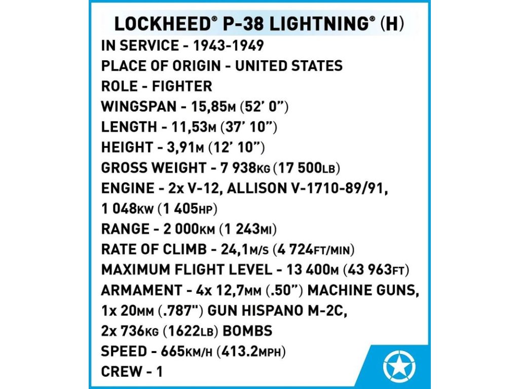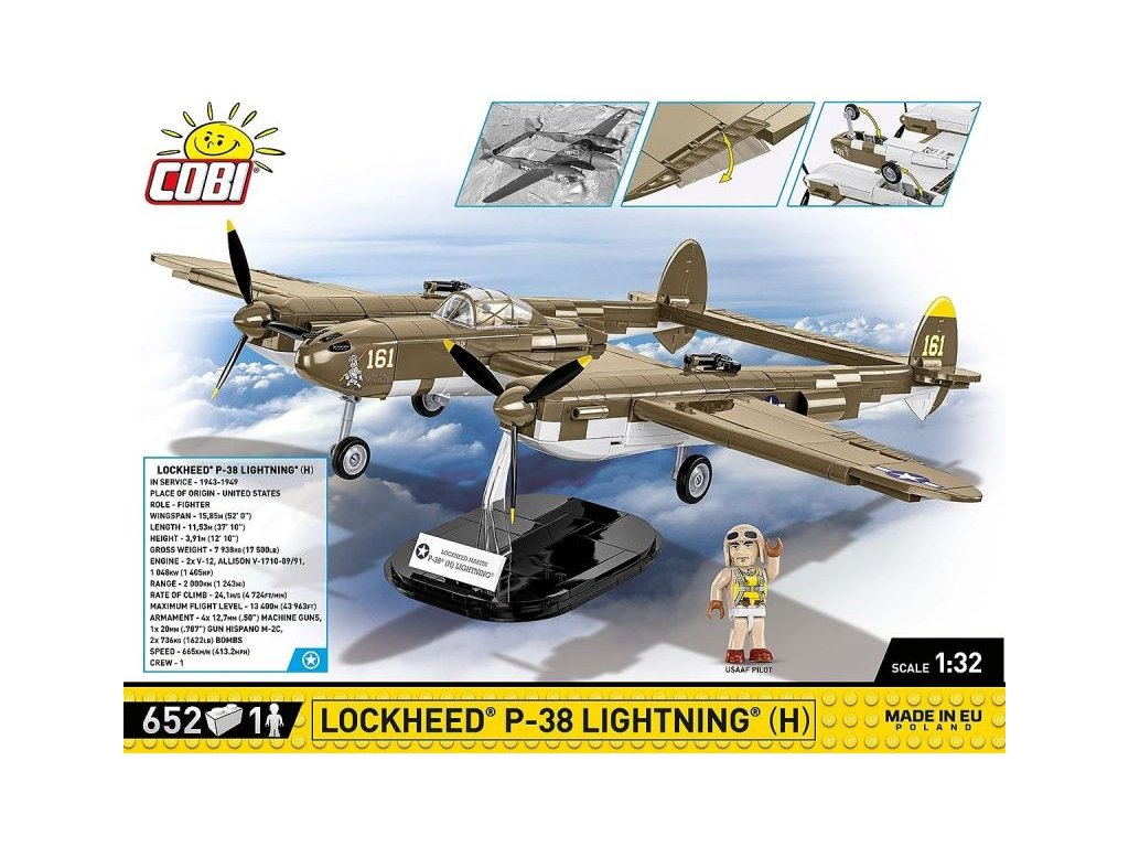 Az építőkészlet az amerikai vadászbombázó repülőgépet, a Lockheed P-38 Lightning H -t ábrázolja a 432. vadászrepülő század USAF álcázásában. A modell a Lockheed Martin Corporation engedélyével készült, és részletesen kidolgozott funkcionális részeket tartalmaz, mint például forgatható légcsavarok, behajtható futómű, állítható vezérsíkok és levehető pilótafülke fedél. Nem hiányzik a pilóta figura sem – John S. Loisel kapitány, az USAF kétszeres légihőse.