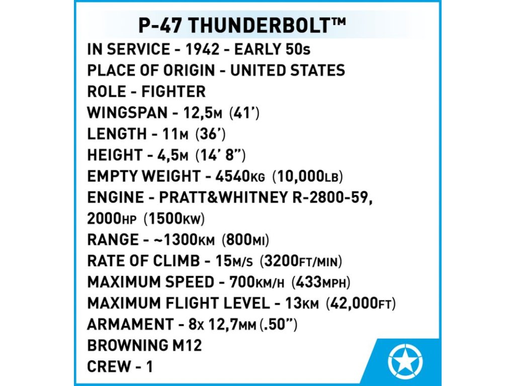 Az amerikai Republic P-47 Thunderbolt vadászgép építőkészlete a 61. vadászszázad Little Chief álcázásában. Az építőkészlet tartalmaz egy forgatható légcsavart, állítható vezérsíkokat, behúzható futóművet és levehető pilótafülke burkolatot, hogy könnyen elhelyezhető legyen Frank W. Klibbe pilóta figurája. A repülőgép saját futóművén vagy a csomagban található állványon is állhat. Az építőkészlet a Northrop Grumman márkatulajdonos hivatalos engedélye alapján készült.