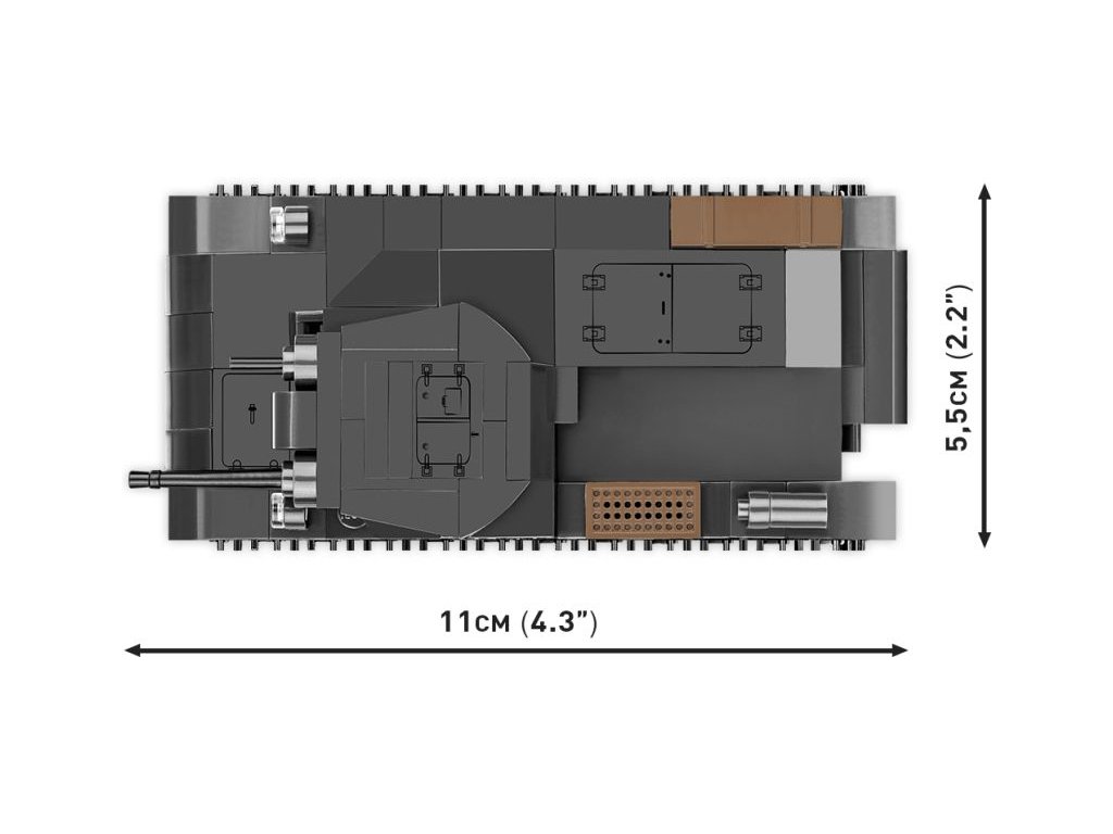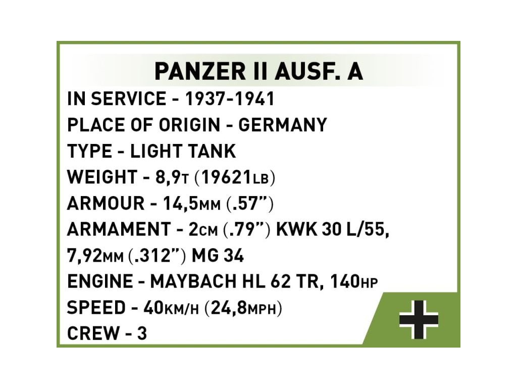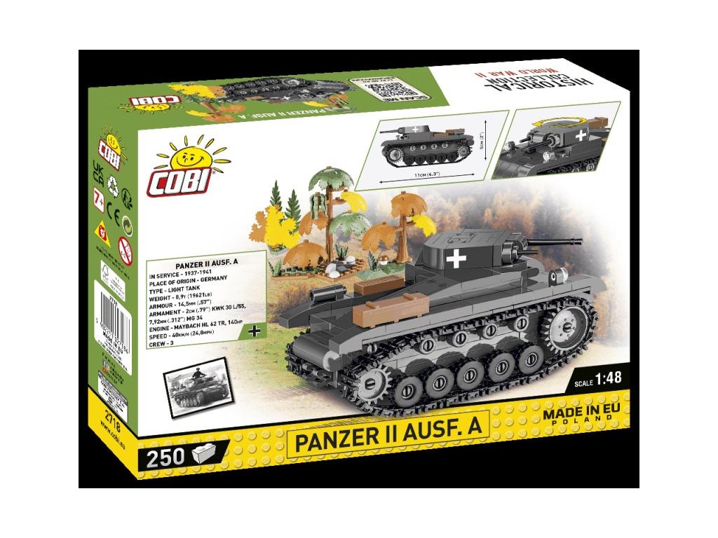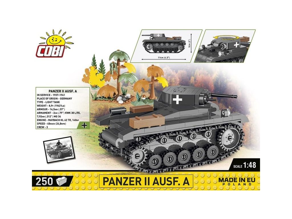 A német könnyű tank PANZER II AUSF. A építőkészlet sötétszürke színben. Az összeszerelt modell forgatható toronnyal rendelkezik ágyúval, géppuskával és fa dobozokkal az oldalán. A tank lánctalpai működőképesek, és a modell könnyen mozgatható csúszásmentes felületen. A készlet része továbbá fák és bokrok is.