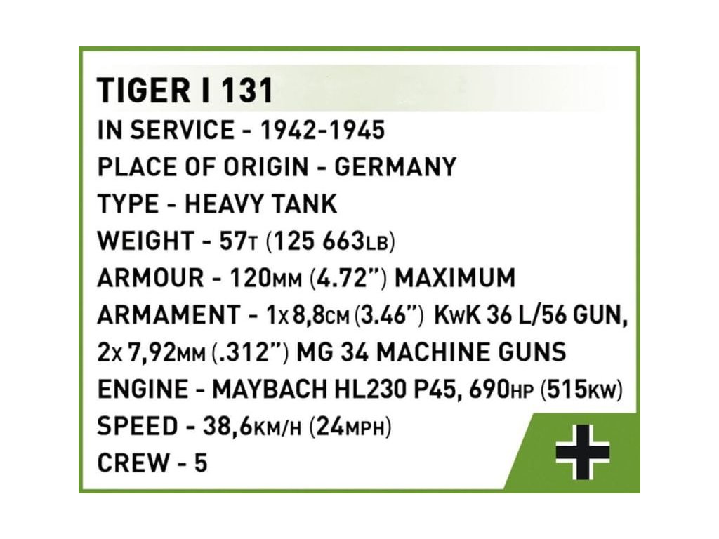 A COBI kockákból készült mini modell 1:72 méretarányban lett tervezve, és 144 kockából áll. Összeállítás után 11 cm hosszú. A kompakt méretek ellenére a modell megőrzi történelmi inspirációjának minden fontos elemét. A jármű oldalán német jelzések vannak nyomtatva. Az olyan részletek, mint a szervizajtók és a motor szellőzése is nyomtatottak! A tank a felszerelt kerekeknek köszönhetően mozgatható. A tank tornya is mozgatható és forgatható.