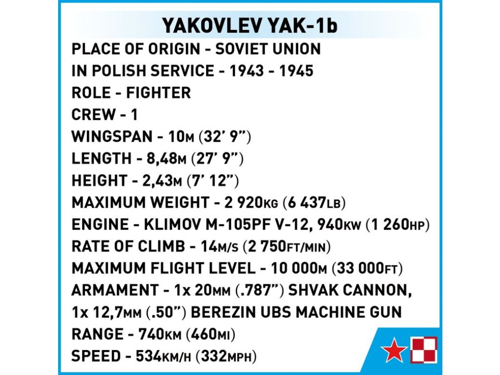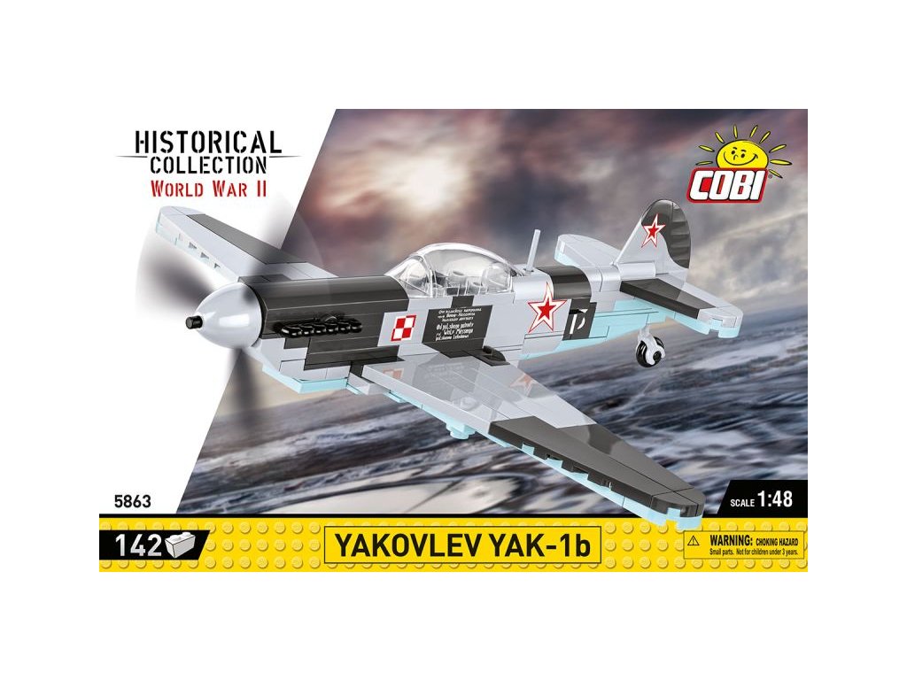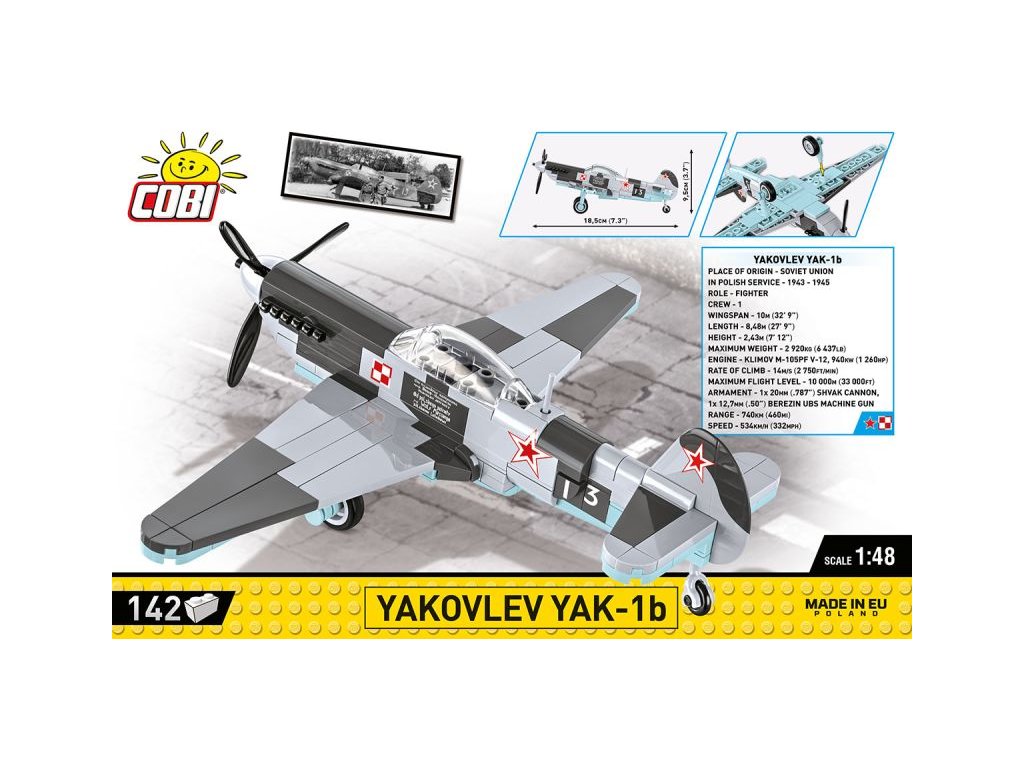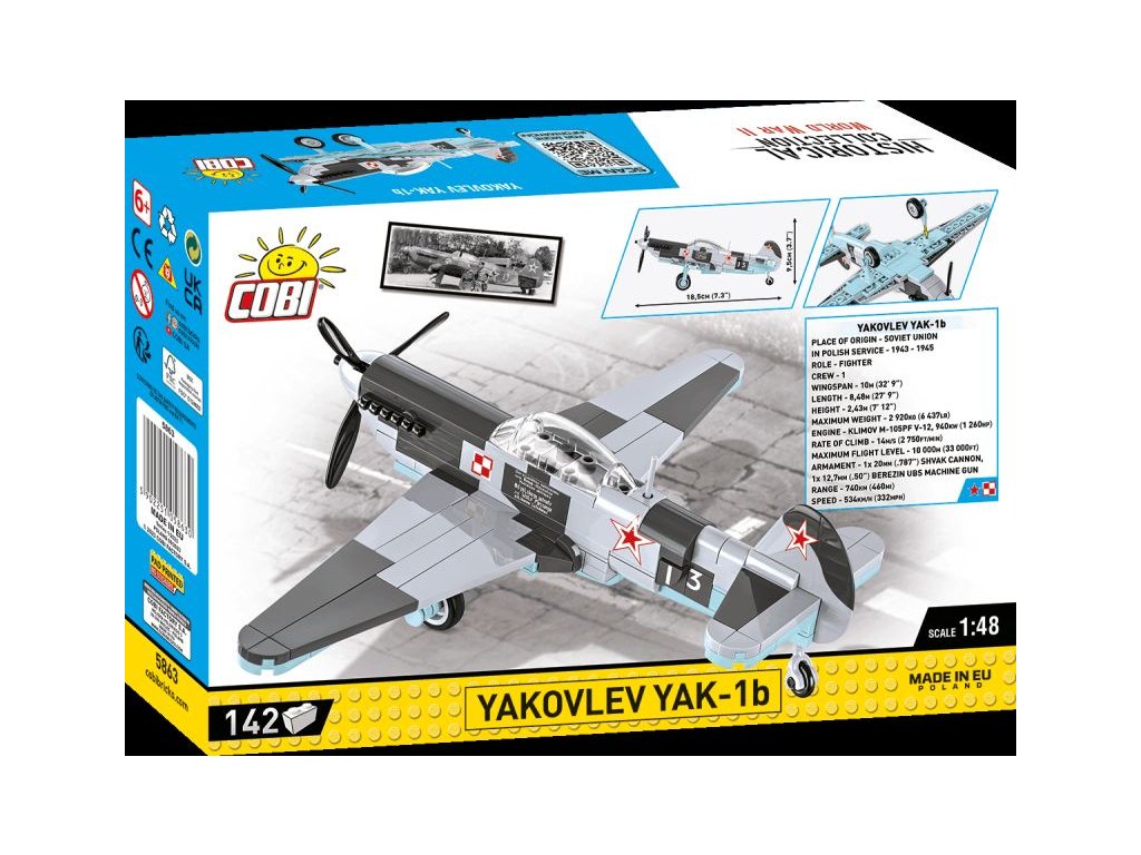 Az orosz JAK-1b vadászrepülőgép építőkészlete a lengyel 1. Warszawa vadászrepülő ezred álcázásában. Az összeszerelt modell forgatható légcsavarral és levehető futóművel rendelkezik. Az 1:48 méretarányú modellek sok örömet okoznak és több helyet biztosítanak a polcon. Kezdő építők számára alkalmas.