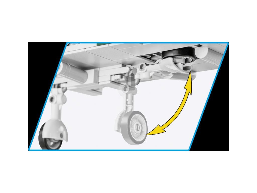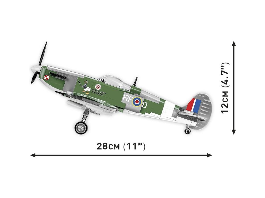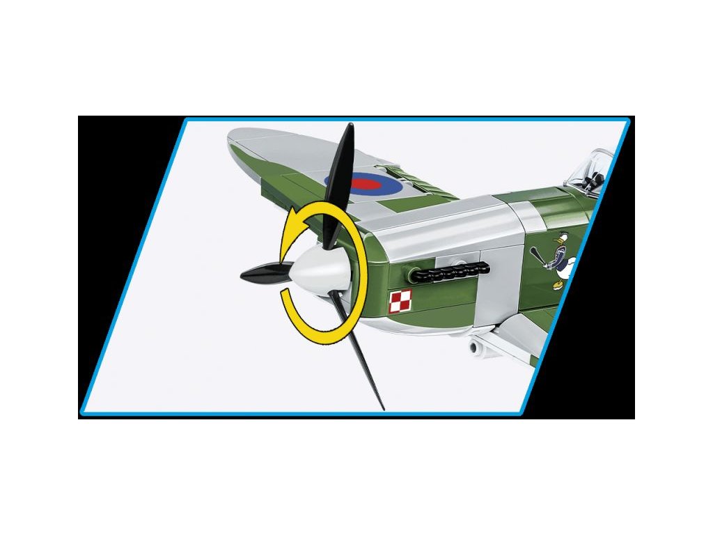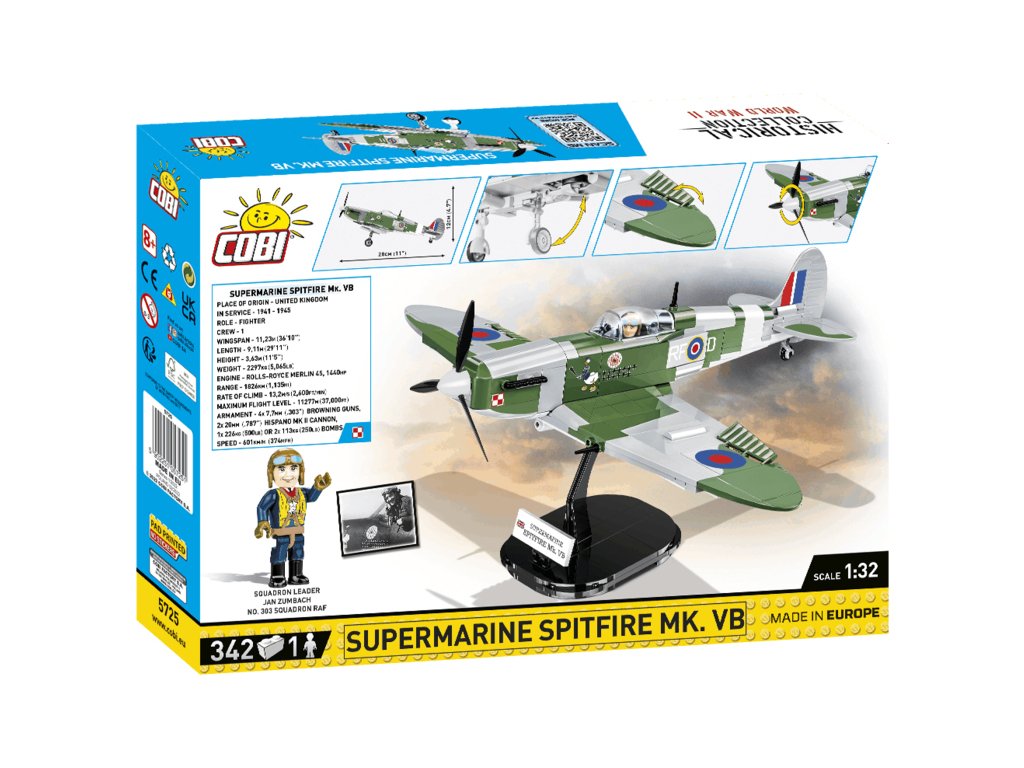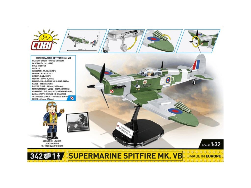 A brit együléses Supermarine Spitfire MK.VB vadászrepülőgép építőkészlete zöld-szürke álcázással. Az összeszerelt repülőgép mozgatható csűrőlapokkal, forgatható légcsavarral, behúzható futóművel és levehető pilótafülke-fedéllel rendelkezik, hogy kényelmesen elférjen a lengyel 303. RAF század parancsnokának, Jan Zumbachnak a figurája. A repülőgép saját futóművén vagy a csomagban található állványon is állhat.