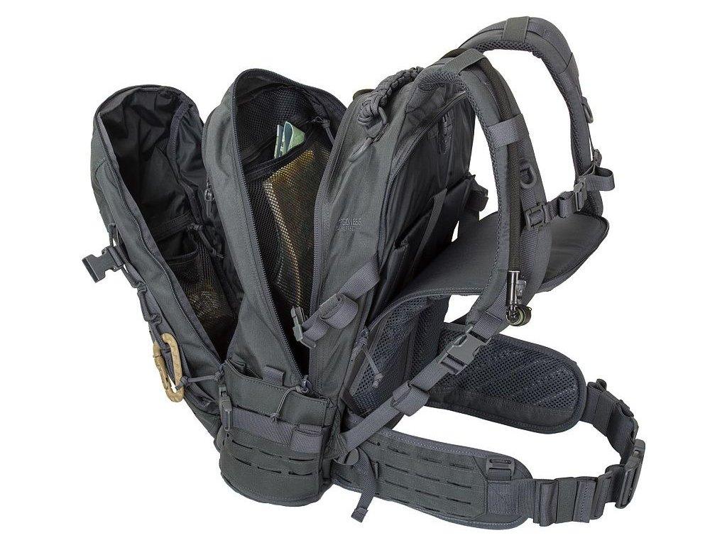 Tépőzáras panel a velcro felvarrók számára. Lézerrel vágott PALS / MOLLE szövés a hátizsák elülső oldalán és az oldalzsebeknél. Két függőleges pánt varrott szemekkel a karabinerek rögzítésére. Oldalsó kompressziós és alsó rögzítő pántok FASTEX csatokkal.