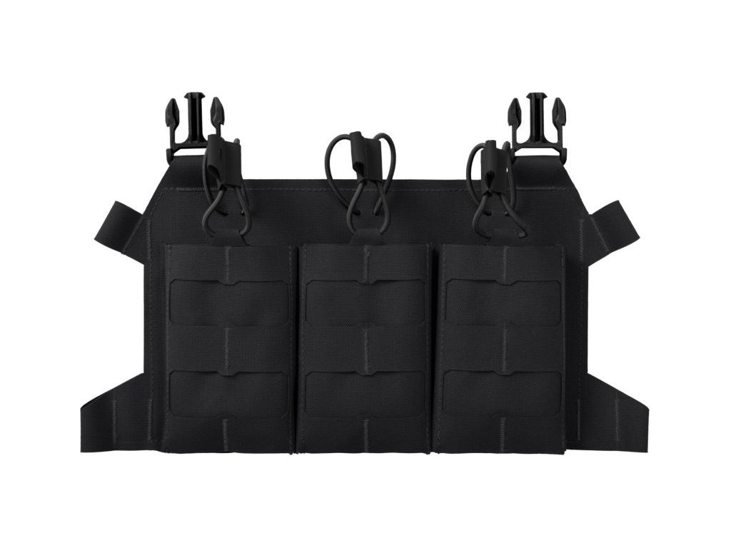 Predný panel s tromi sumkami na zásobníky od Direct Action vyrobený z laminátu Cordura 500D, určený na použitie s vestami radu BEARCAT® a SPITFIRE®. Účelom panelu je nosiť až tri zásobníky pre M4/AR15. Vďaka skeletovej konštrukcii patrí k najľahším vo svojej kategórii a zabezpečuje minimalizmus. Za upevnenie zásobníkov z hornej strany sú zodpovedné bungee šnúrky.