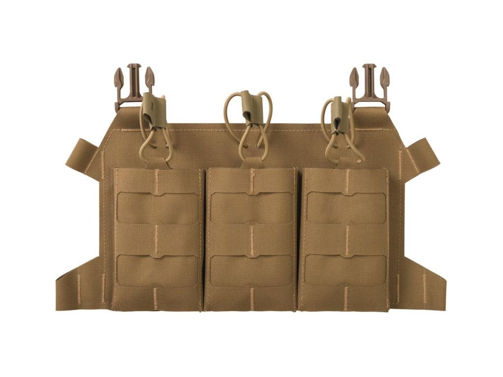 Predný panel s tromi sumkami na zásobníky od Direct Action vyrobený z laminátu Cordura 500D, určený na použitie s vestami radu BEARCAT® a SPITFIRE®. Účelom panelu je nosiť až tri zásobníky pre M4/AR15. Vďaka skeletovej konštrukcii patrí k najľahším vo svojej kategórii a zabezpečuje minimalizmus. Za upevnenie zásobníkov z hornej strany sú zodpovedné bungee šnúrky.