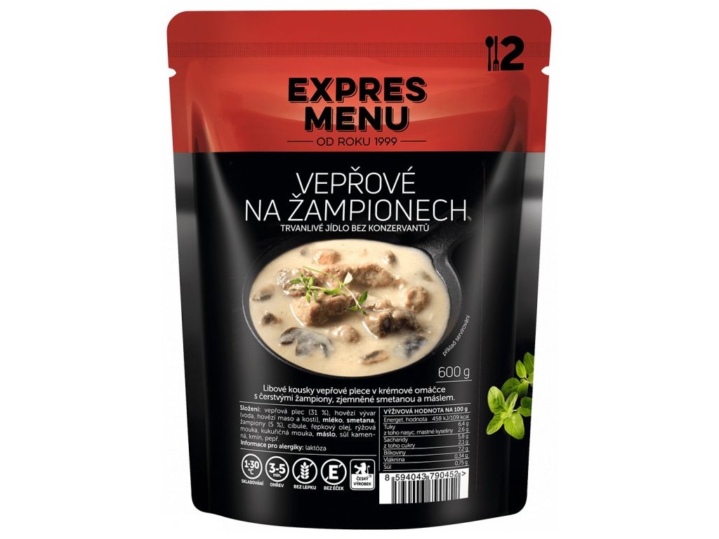 Összetevők: sertéslapocka (31%), marhahúsleves (víz, marhahús és csontok), tej, tejszín, csiperkegomba (5%), hagyma, repceolaj, rizsliszt, kukoricaliszt, vaj, kősó, kömény, fekete bors.