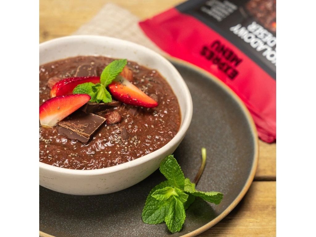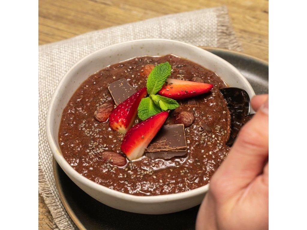 Ízletes és egészséges chia desszert csokoládédarabokkal, eperrel és mandulával, enyhén édesítve természetes datolyapasztával. Kiváló választás édes reggelihez, tízóraihoz vagy egészséges nassolnivalóként a nap folyamán.