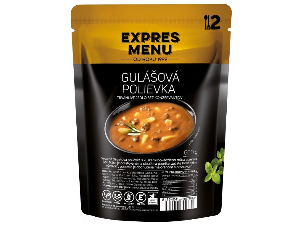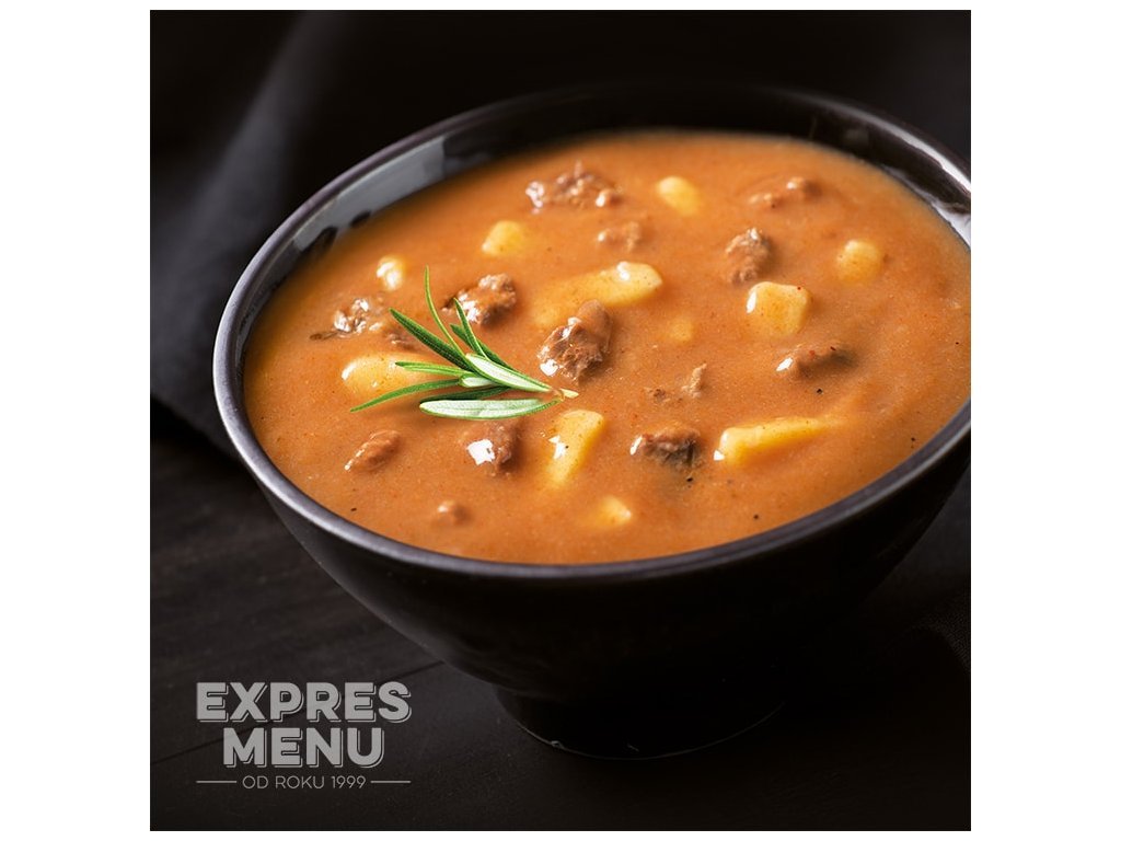 Összetevők: marhahúsleves (víz, marhahús és csontok), burgonya, marhahús eleje, hagyma, rizsliszt, kukoricaliszt, repceolaj, fokhagyma, kősó, őrölt paprika, majoránna, kömény, őrölt fekete bors.