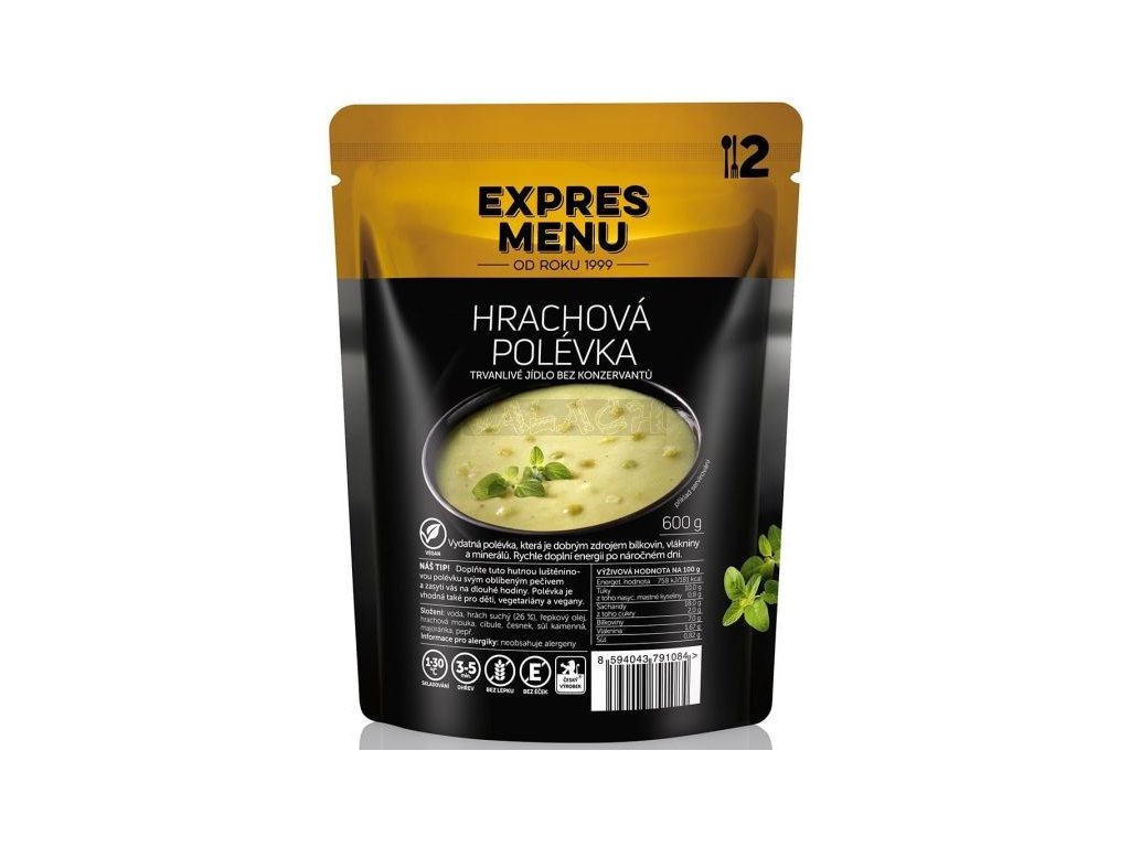 Összetevők: víz, száraz borsó (26%), repceolaj, borsóliszt, hagyma, fokhagyma, kősó, majoránna, fekete bors.