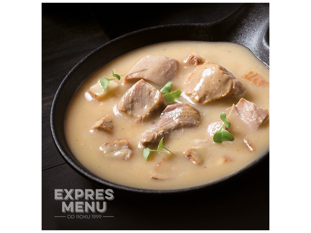 Pulykacomb sovány darabjai puhára párolva illatos füstölt szalonna, hagyma és fűszerek mártásával.