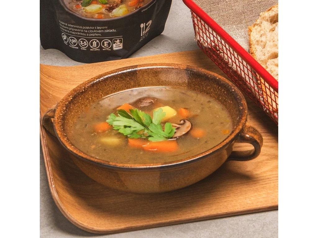 Kiadós zöldségleves hagymaalapon, majoránnával, fekete borssal ízesítve, aromás erdei gombákkal gazdagítva. Kiváló választás tízóraira vagy könnyű ebédre – alkalmas gyerekeknek, vegetáriánusoknak és vegánoknak is.