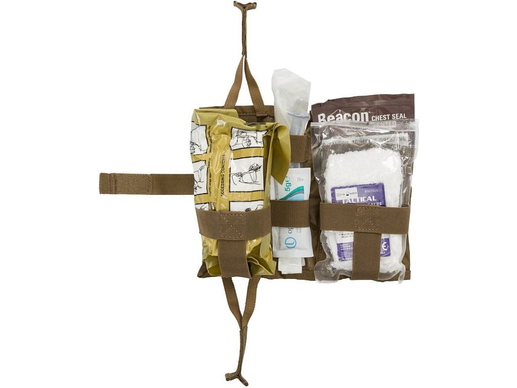 A belső rugalmas hurok a helyén tartja a felszerelését. A külső rugalmas zsinór csökkentheti a zseb méretét, vagy használható a torniquet szállítására. A Med Kit készletet függőlegesen vagy vízszintesen is lehet szállítani. A Velcro panel lehetővé teszi a személyre szabást. A pouch rögzíthető a MOLLE / PALS rendszerrel, vagy közvetlenül az 50 mm széles övre is rögzíthető.