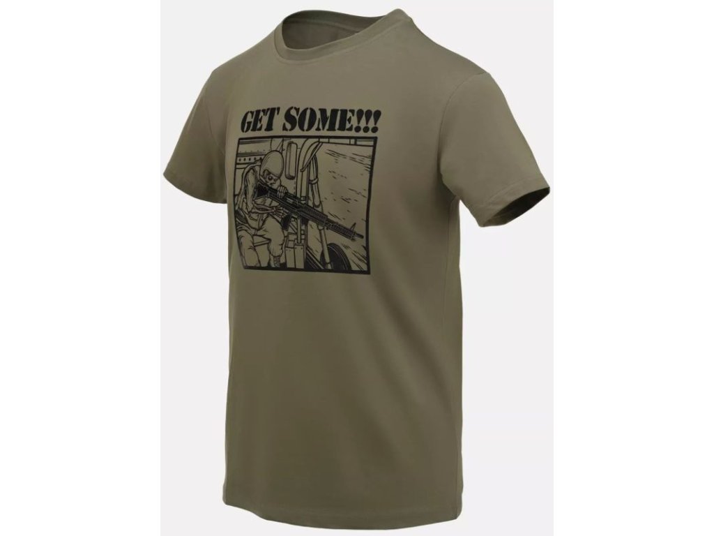 Klasszikus pamut póló, amely utalást tartalmaz Stanley Kubrick 1987-es Full Metal Jacket című filmjének ikonikus jelenetére, amelyben Hartman őrmester helikopterről lő és kiáltja: „Get some!” A pólók jellegzetes formája a 20. század elején alakult ki az eredeti alsóneműből (ún. „union suit”). A második világháború után a T-alakú pamut pólók nagyon népszerűvé váltak, részben Marlon Brando és James Dean filmjeiben való viselésüknek köszönhetően.