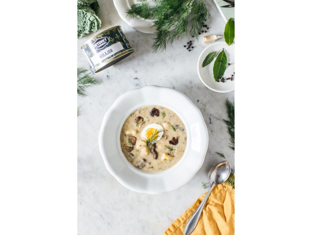 Összetevők: Ivóvíz, burgonya 21,6%, barna gomba 11,9%, FŐZŐTEJSZÍN 12% - 7,2%, TOJÁS, BÚZALISZT, napraforgóolaj, ecet, cukor, VAJ, citrom, étkezési só, kapor, gombaleveskocka, őrölt kömény, fekete bors, babérlevél.