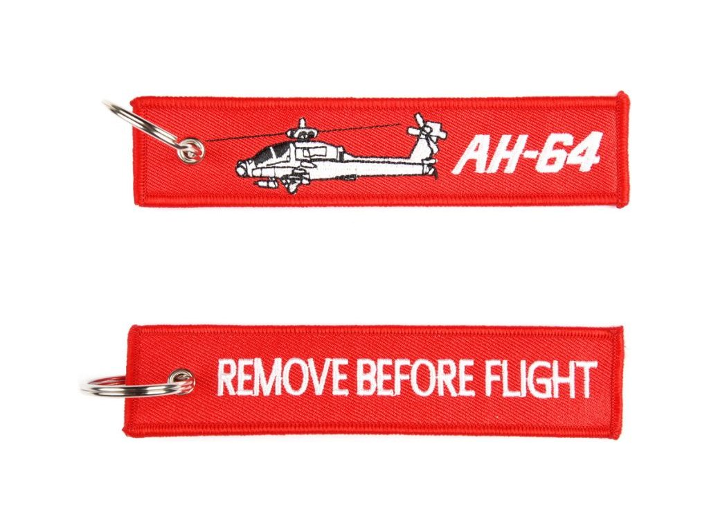 Kulcstartó REMOVE BEFORE FLIGHT felirattal az egyik oldalon. A másik oldalon az AH-64 látható.