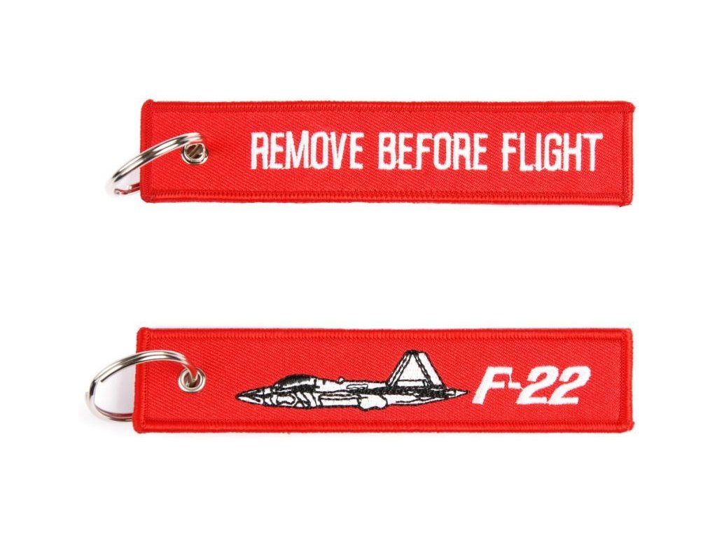 Kulcstartó gyűrűvel és REMOVE BEFORE FLIGHT felirattal az egyik oldalon. A másik oldalon egy F-22 látható.